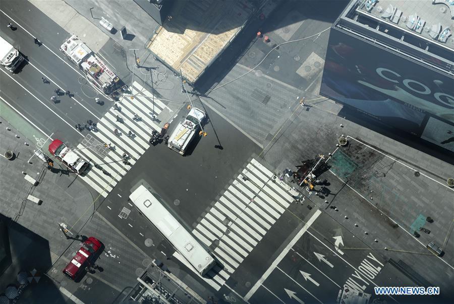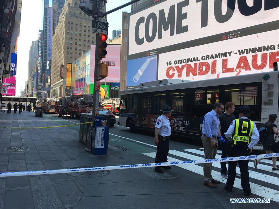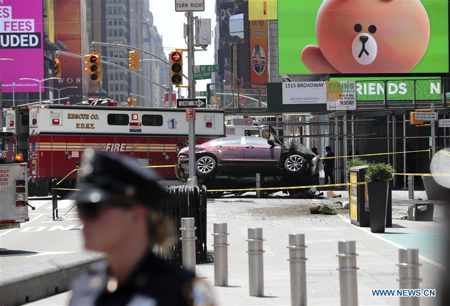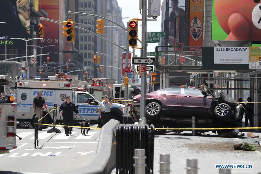 Security members stand guard near the site where a speeding vehicle struck pedestrians at Times Square in New York City, the United States, on May 18, 2017. At least 10 people were injured and receiving treatment after a speeding vehicle struck pedestrians on sidewalk in New York City's Times Square on Thursday, eyewitnesses said. (Xinhua/Kang Dexi)