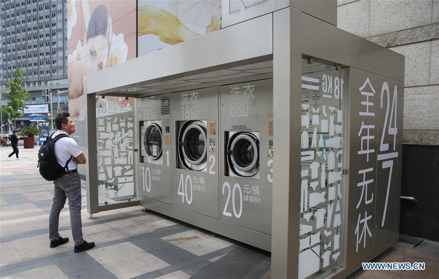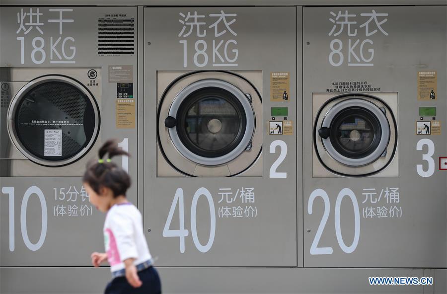 A girl walks past shared washing machines on a street in Shanghai, east China, May 19, 2017. Shared washing machines are served for public use here and users can pay with either smartphone or cash. (Xinhua/Ding Ting)