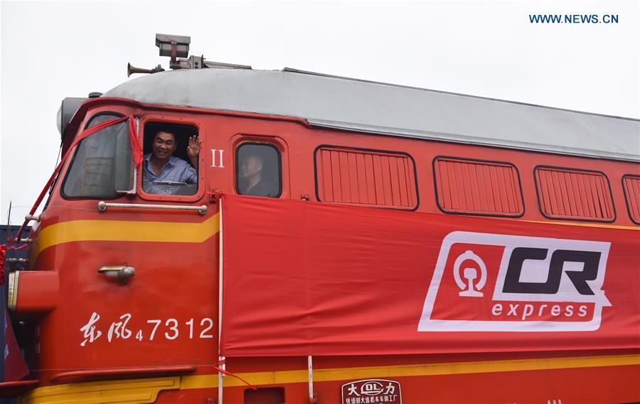 Photo taken on May 22, 2017 shows the first freight train of China Railway Express from the city of Shenzhen to European countries at Yantian Port in Shenzhen, south China's Guangdong Province. Freight train X8428, with a total travelling length of 9900 kilometers and bound for Minsk of Belarus, departed from Shenzhen's Yantian Port on Monday, marking the opening of a new Sino-European freight train route starting from Shenzhen. (Xinhua/Mao Siqian)