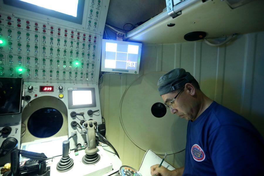 Jiaolong, China's manned submersible, is lowered into the sea at the start of a dive on May 25, 2017. The submersible descends to 6,300 meters in the Mariana Trench in the western Pacific Ocean, the site of the oceans' deepest valley. (Photo/Xinhua)