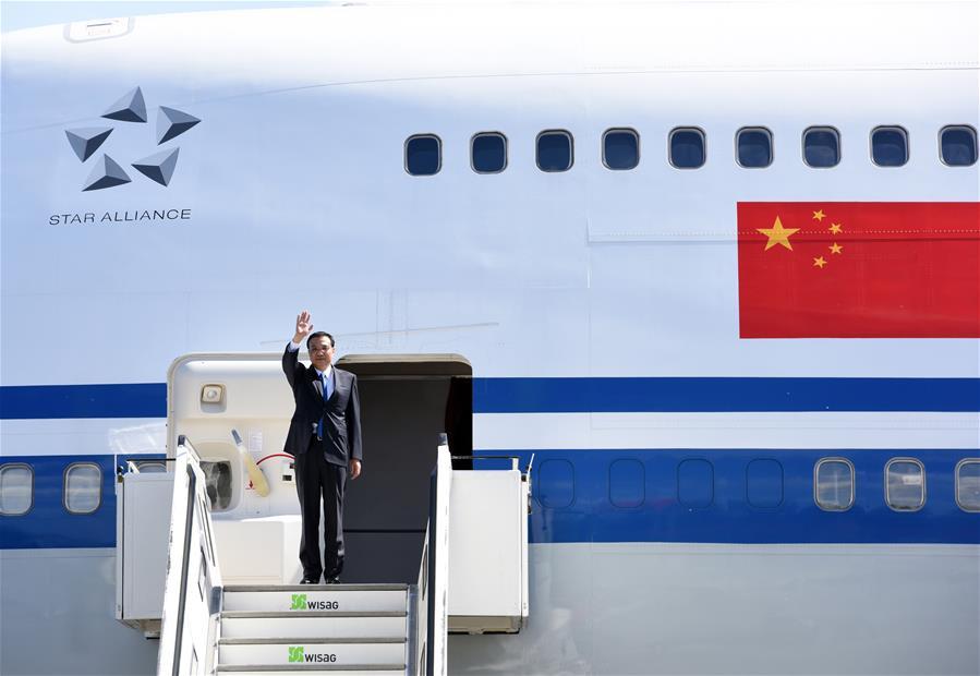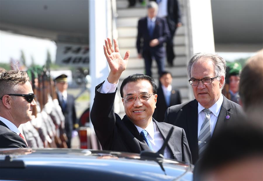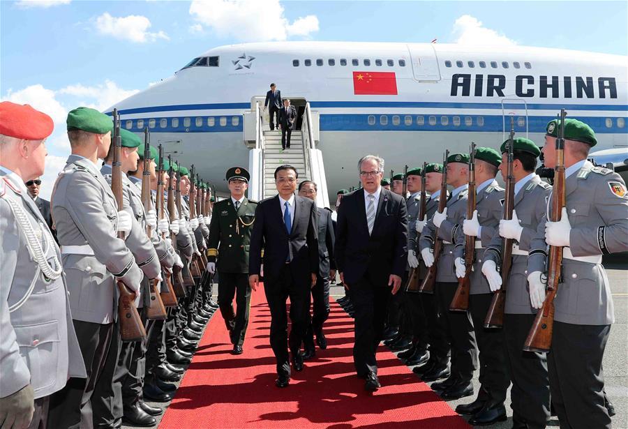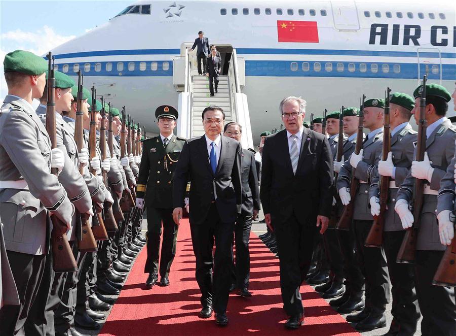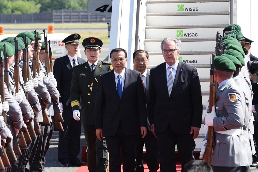 Chinese Premier Li Keqiang (R) attends a welcome ceremony held by German chancellor Angela Merkel before an annual meeting between Chinese and German heads of government in Berlin, Germany, May 31, 2017. (Xinhua/Zhang Duo)