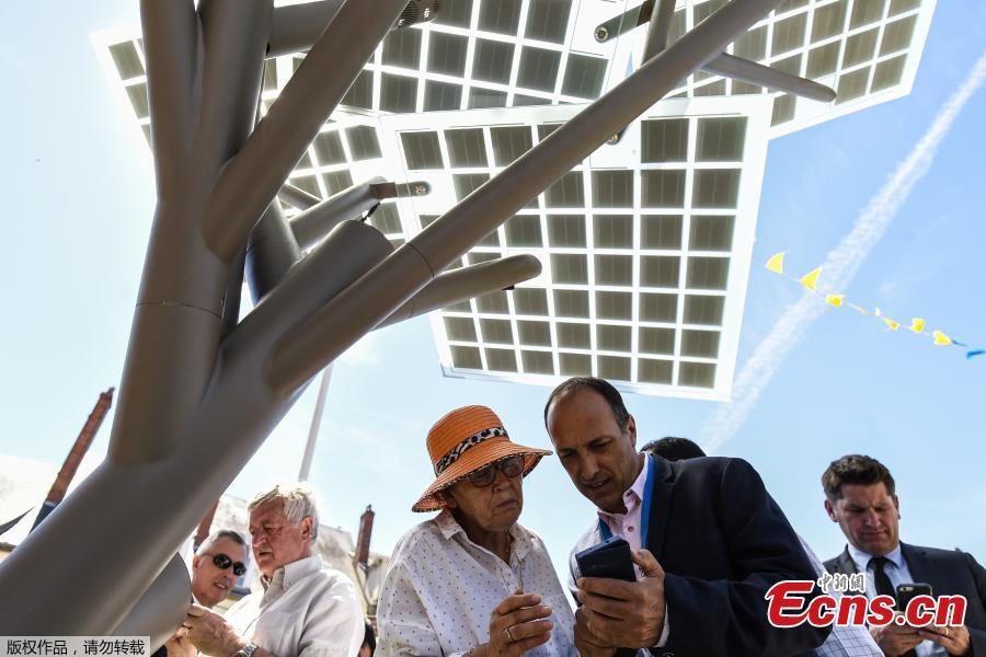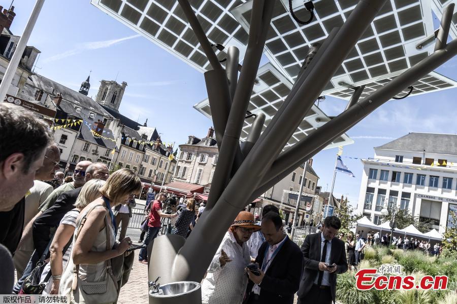 People try to connect their smart-phones to the first 'eTree' provided in Europe by Solar Tree Europ, a French-Israeli startup, during an inauguration ceremony in Nevers, northern France, May 29, 2017. The solar tree with giant square leaves that converts sunlight into electricity allows passersby to charge their phones, surf the internet or just enjoy the shade. (Photo/Agencies)