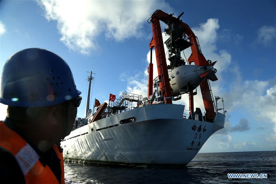 China's manned submersible "Jiaolong" is despatched on its fifth, and last, dive of the year in the Mariana Trench, June 1, 2017. Jiaolong will descend to a depth of 6,700 meters. The mission is the third and final stage of China's 38th oceanic scientific expedition, which features surveys in the Yap and Mariana trenches. (Xinhua/Liu Shiping)