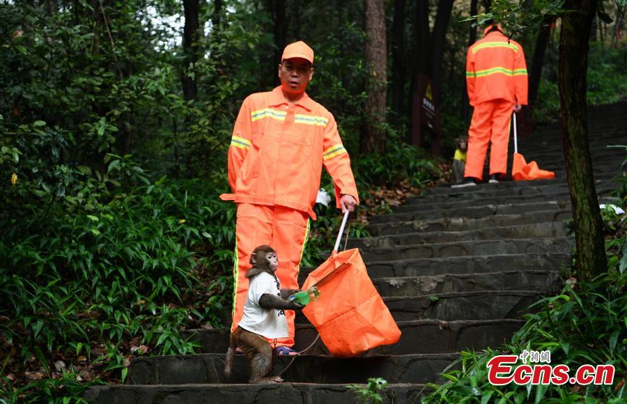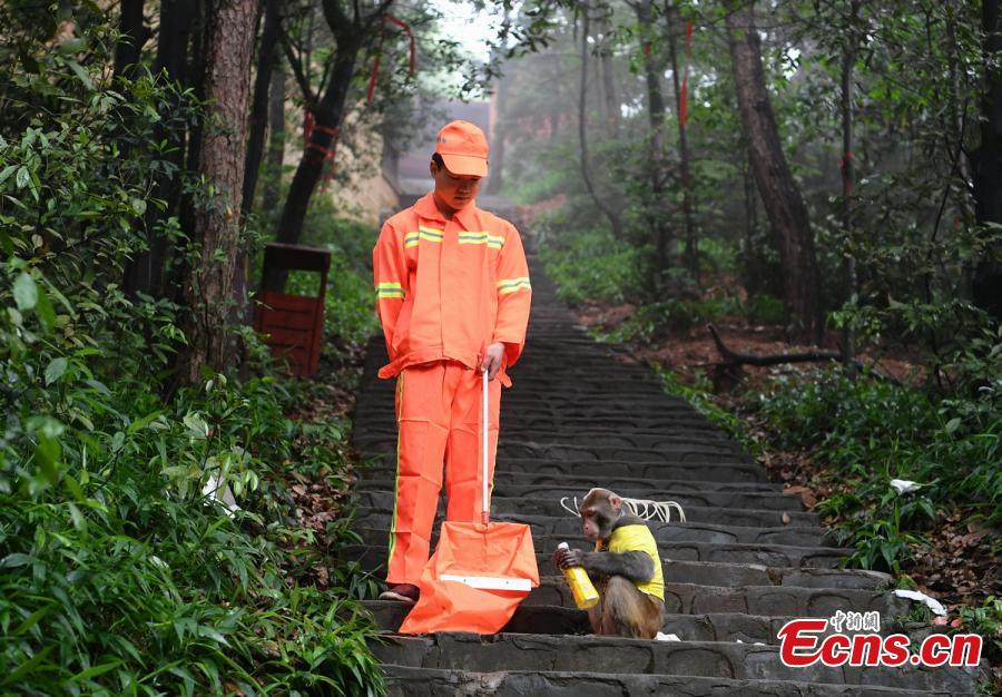 A monkey helps a worker clean up waste on a mountain in Shiyan Lake scenic spot in Changsha City, Central China’s Hunan Province, June 5, 2017. (Photo: China News Service/Yang Huafeng)