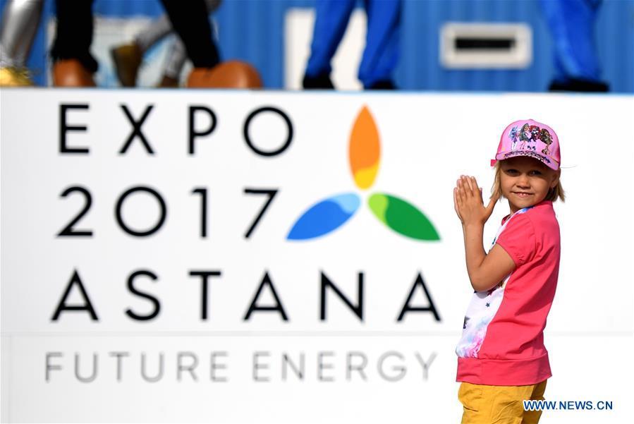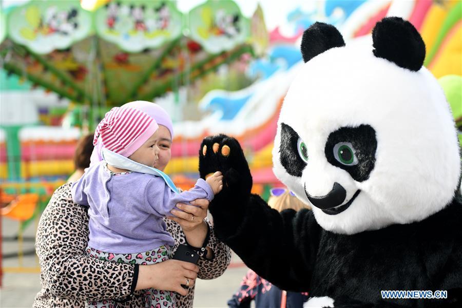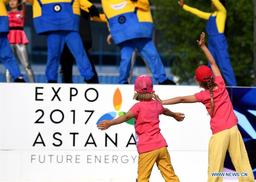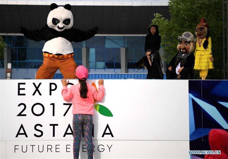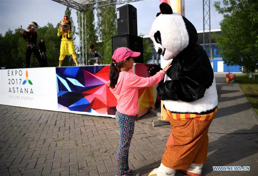 Dancers wearing panda and traditional Kazakh folk costumes pose during a performance of Sam Ruk dance group from Eurasian University in Astana, Kazakhstan, June 5, 2017. (Xinhua/Wu Xiaoling)