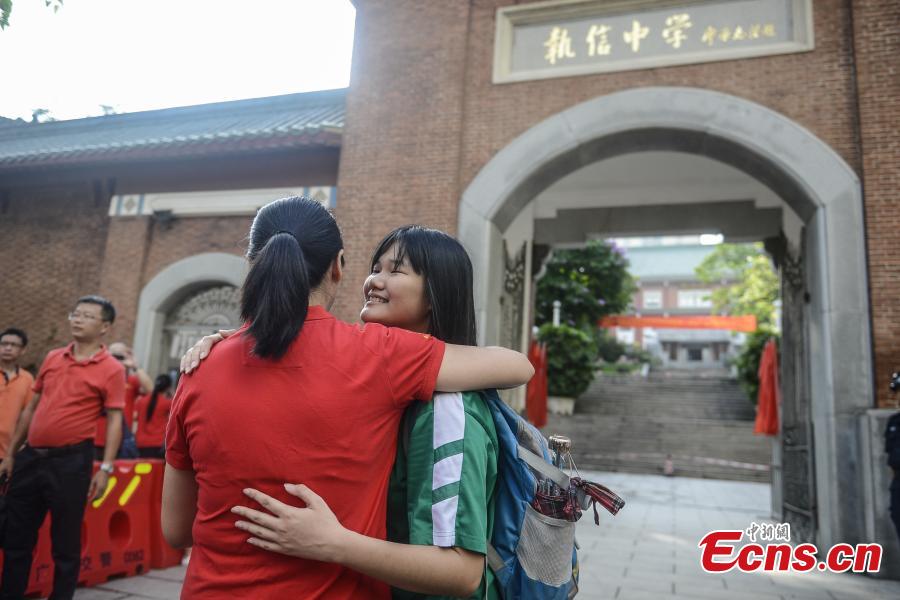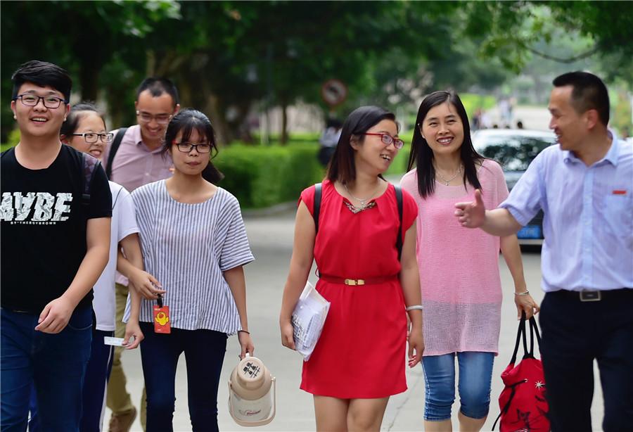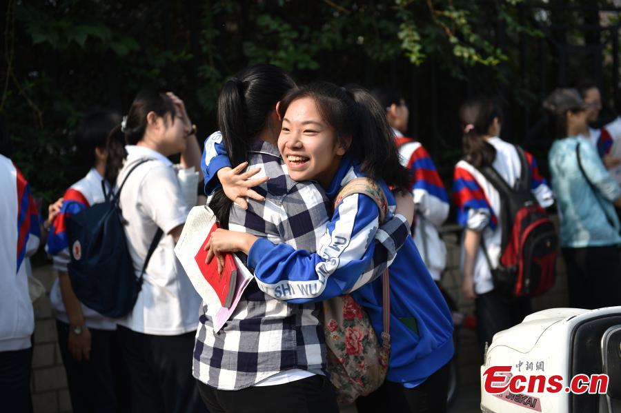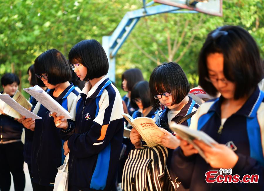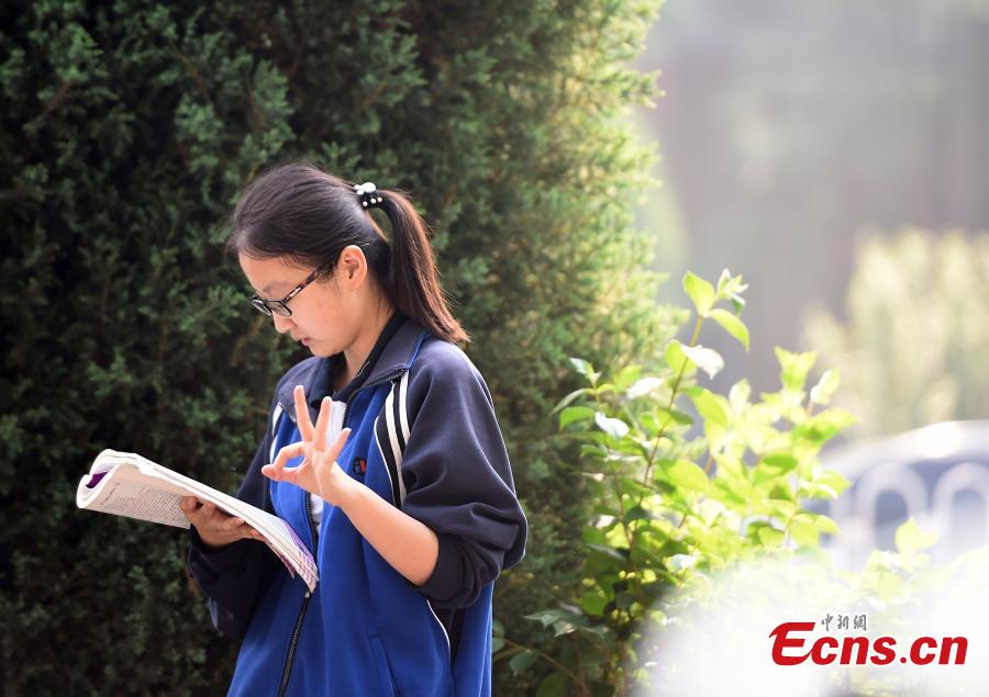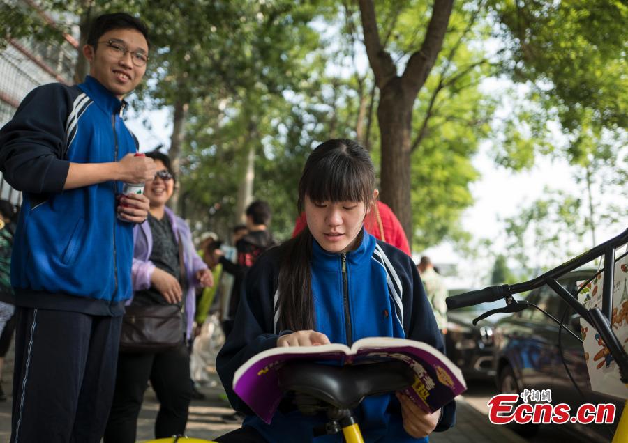 A students does some last-minute cramming outside a testing site in Beijing on June 7, 2017. According to the Ministry of Education, a total of 9.4 million high school students will sit the 2017 examination, which kicks off on June 7 and lasts for two days. (Photo: China News Service/Hou Yu)