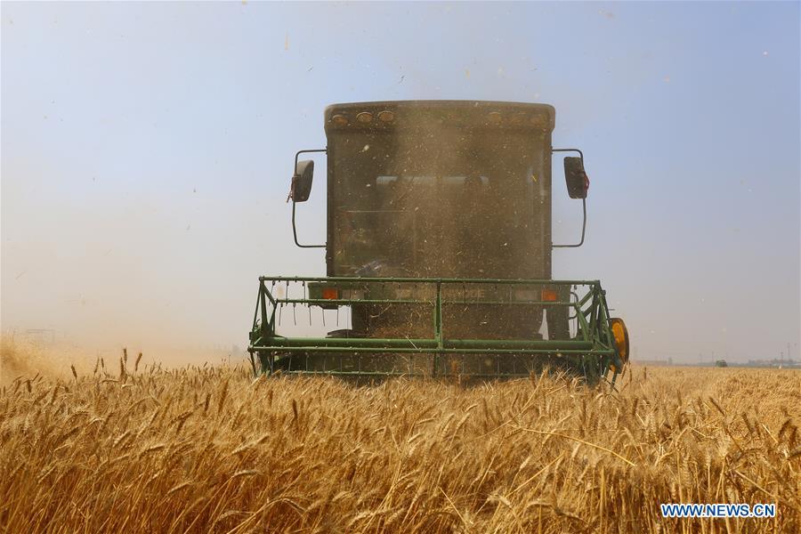 Harvesters collect wheat in the fields in Cheng'an County, north China's Hebei Province, June 7, 2017. (Xinhua/Mu Yu)