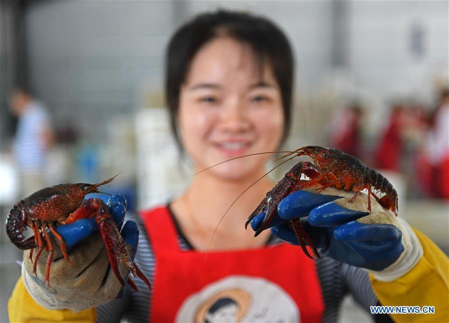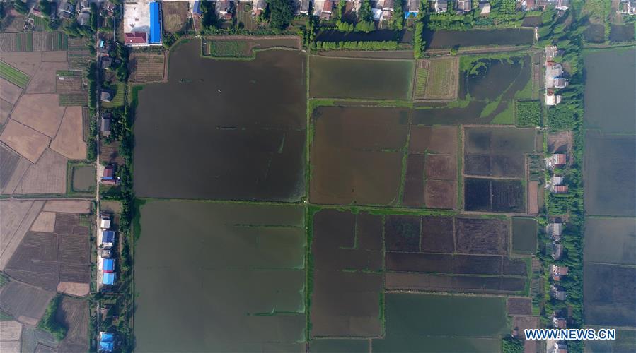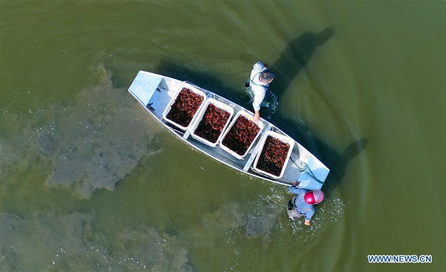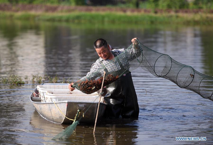 Farmers collect crayfish raised in paddy field in Dongting Lake area of Nanxian County, central China's Hunan Province, June 7, 2017. (Xinhua/Li Ga)