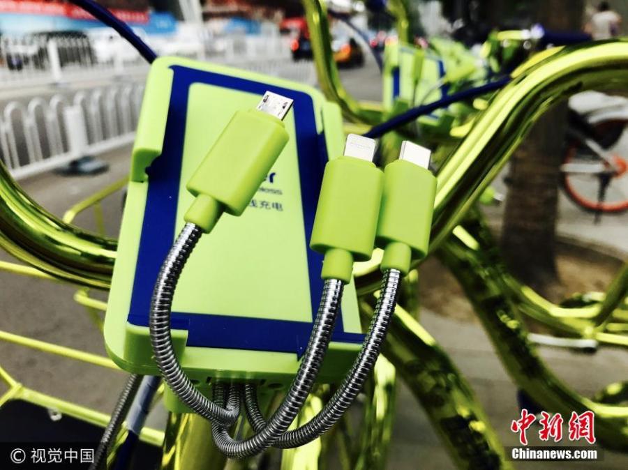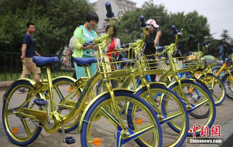 Golden bikes are seen parked on a street in Beijing on June 8, 2017. "Tuhao gold" is the color of the latest company to enter the rapidly expanding and increasingly crowded bike share market in China. The golden bikes have blue tyres and seats, a mobile phone holder, and cables attached to the front to charge your mobile phone. There is also the option to wirelessly charge your battery. (Photo/VCG)