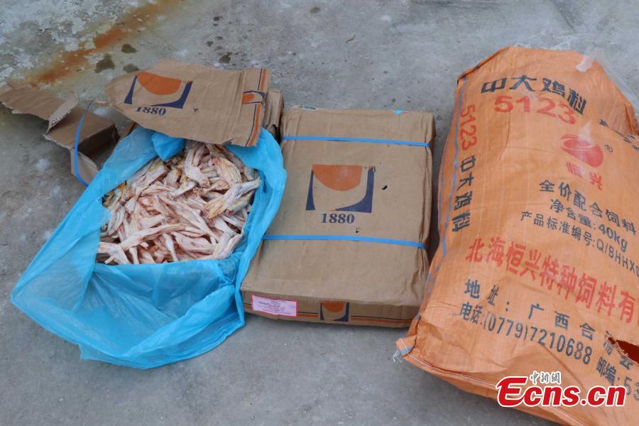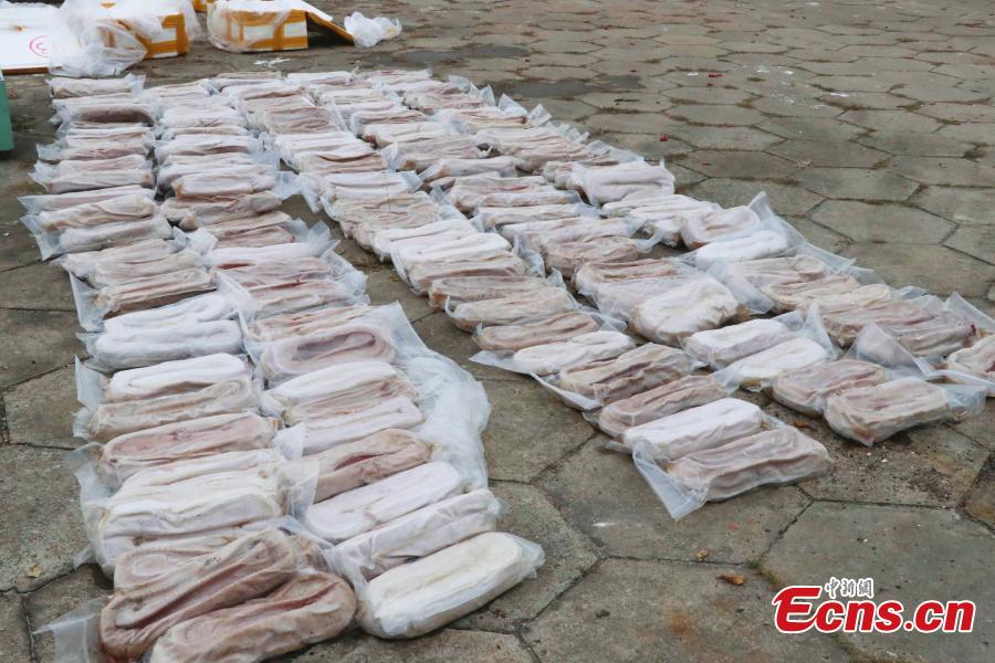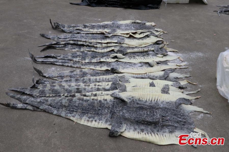 Crocodile skins and python meat are among items seized in raids against smuggling in Southwest China’s Guangxi Zhuang Autonomous Region. Local authorities said on Friday that the coast guard seized 1,609 crocodile skins, 529.1 kilograms of python meat and other frozen meat totaling 514 tons in 129 separate smuggling cases. The illicit goods had a potential market value of 71.25 million yuan ($10.5 million). (Photo: China News Service/Wang Lidan)