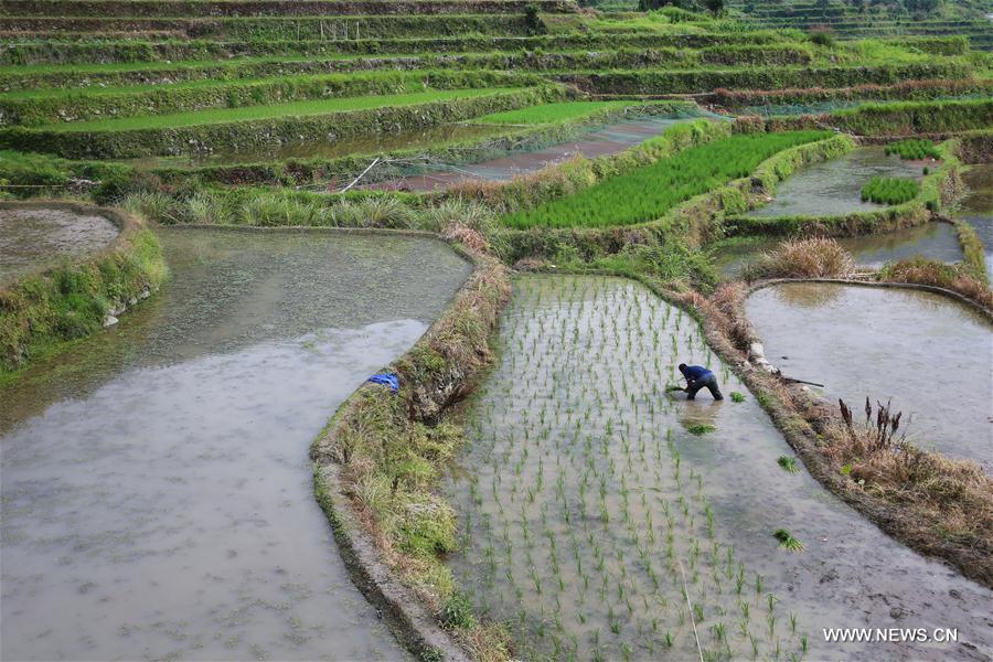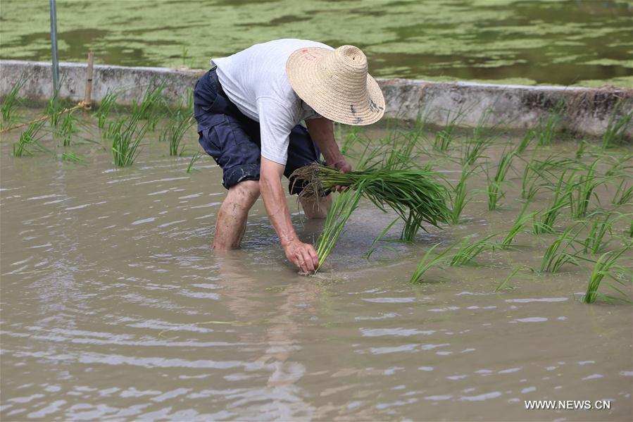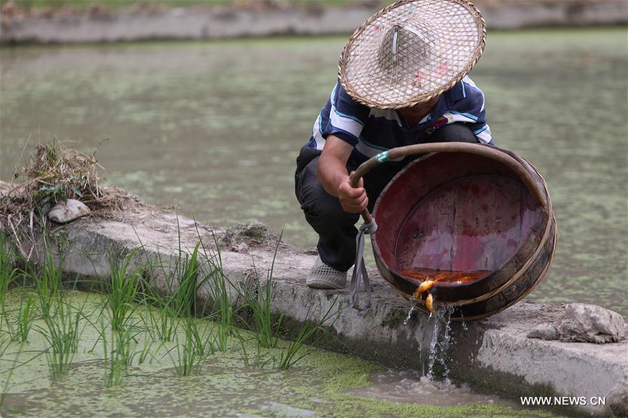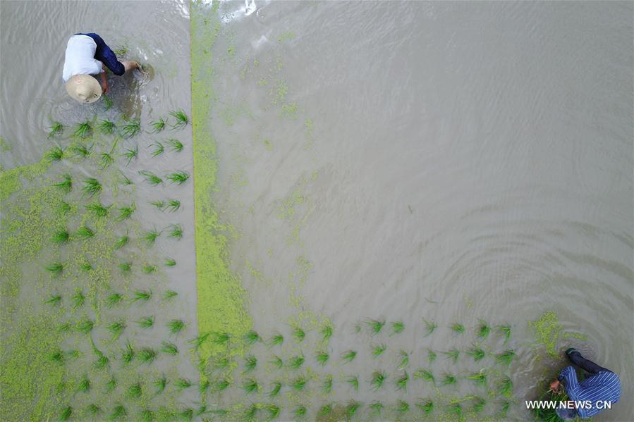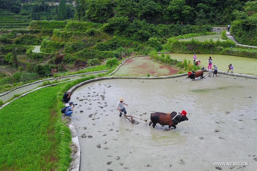 Farmers plow the field with cattle in Qingtian County, east China's Zhejiang Province, June 11, 2017. (Xinhua/Zhang Cheng)