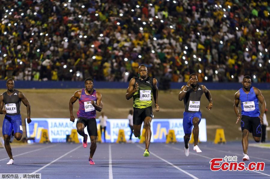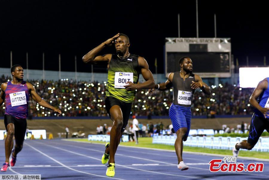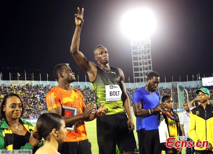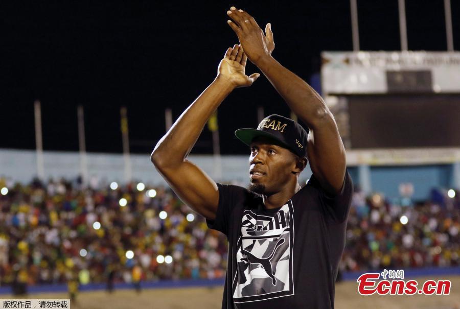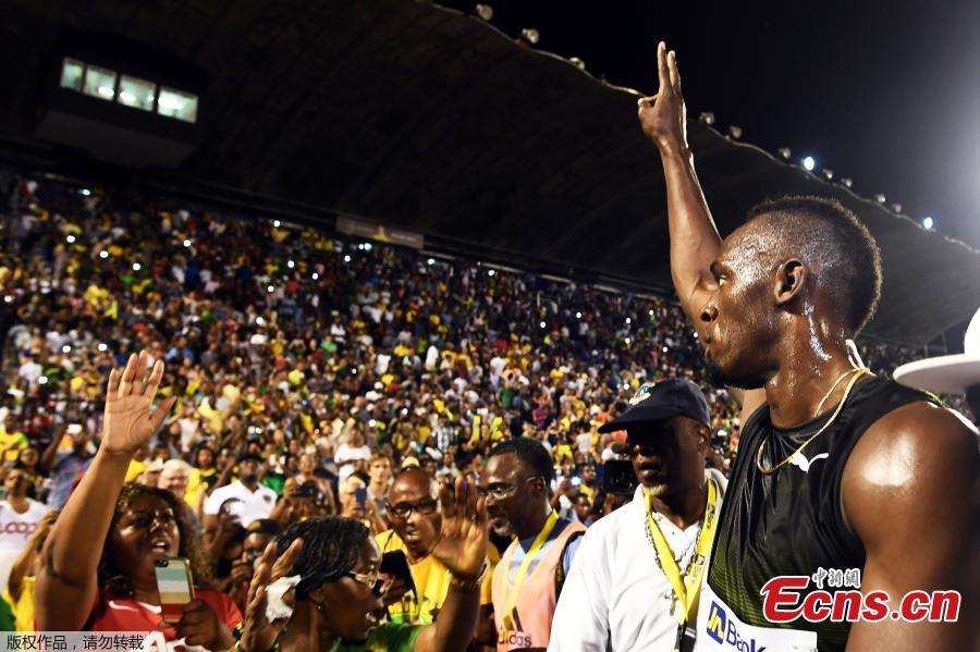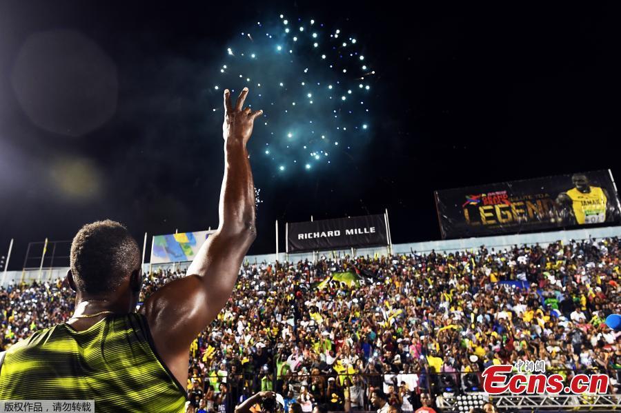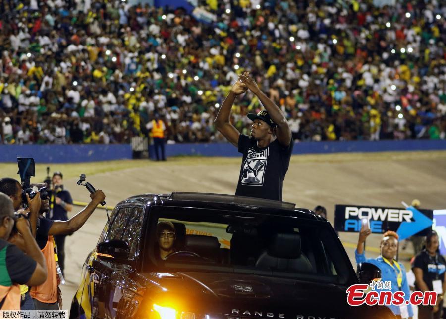 Jamaica's Olympic champion Usain Bolt greets the crowd while riding around the National Stadium before running his final 100 meters sprint at the 2nd Racers Grand Prix, in Kingston, Jamaica June 10, 2017. An emotional Usain Bolt recovered from a moderate start to win his final 100 meters sprint on home soil, clocking 10.03 seconds at the 2nd Racers Grand Prix in Kingston on Saturday. The multiple Olympic and world gold medalist, who will retire after August's world championships in London, confessed to being a nervous wreck before running his last race on Jamaican soil. (Photo/Agencies)