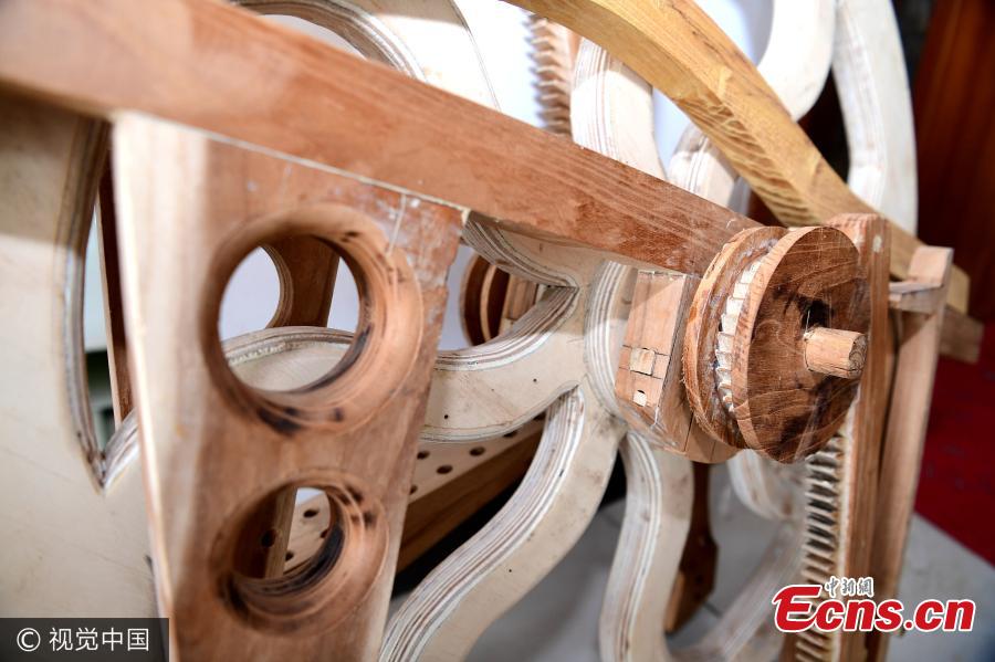 Shen Hao shows his homemade wooden bike at his residence in Haian County, East China’s Jiangsu Province, June 12, 2017. The bike measures 204 centimeters long and 116 centimeters high with wheels 76 centimeters in diameter. Shen became interested in creating the bike after was inspired by a TV program. It took him 20 days to make and he now plans improvements. Shen said he learned carpentry for several months at age 17. (Photo/VCG)