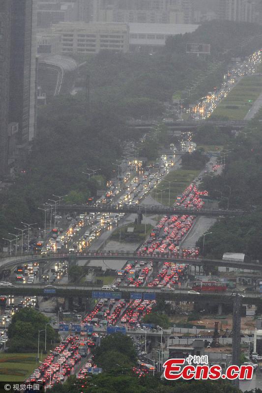 Traffic gridlock on Shennan Avenue in Shenzhen City, South China’s Guangdong Province, June 13, 2017 after typhoon Merbok landed. (Photo/VCG)