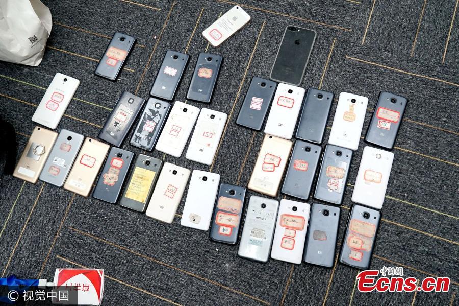 Police detain suspects involved in an online fraud scheme in Wuhan City, the capital of Central China’s Hubei Province, June 12, 2017. Police detained 808 suspects and seized more than 800 computers, 2,000 cellphones and 3,000 bank cards. This marked the largest number of suspects caught in the national campaign against illegal online financial platforms. (Photo/VCG)
