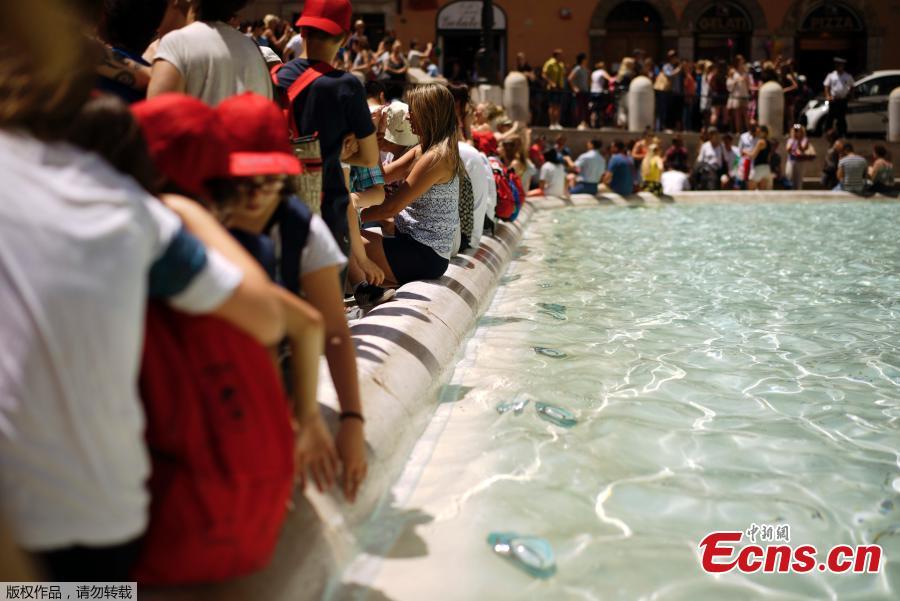 A municipal police office talks on his radio as he overlooks tourists at Rome's Trevi fountain, June 12, 2017. City hall on Monday announced that Mayor Virginia Raggi had signed an ordinance aimed at protecting some 40 fountains of historic or artistic interest to try to protect the monumental works, not infrequently trashed by tourists, sports fans and Romans. Tourists, who put their feet into water to calm themselves, will face 240 Euro penalty. (Photo/Agencies)