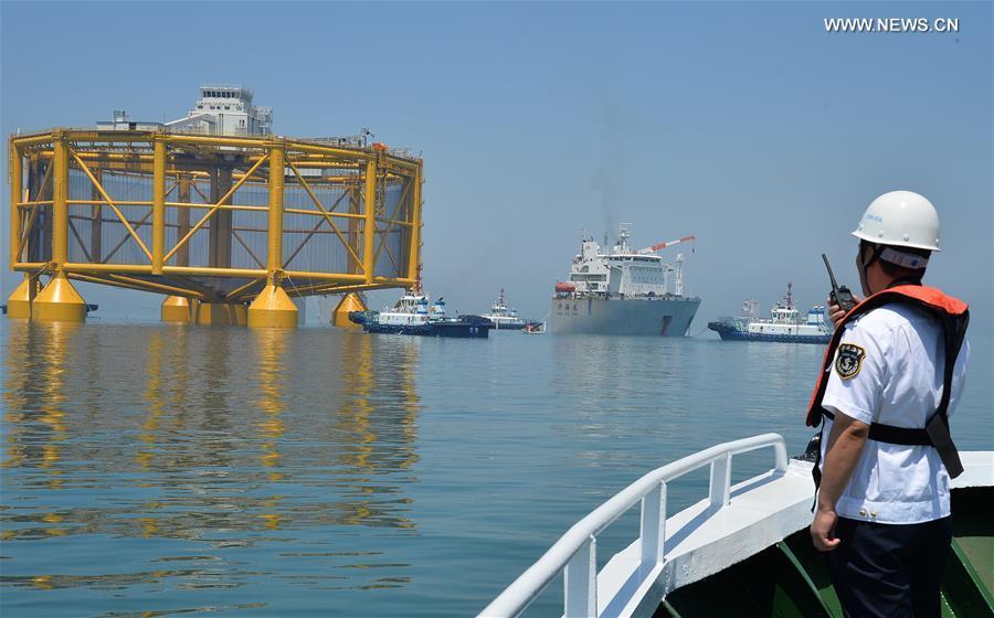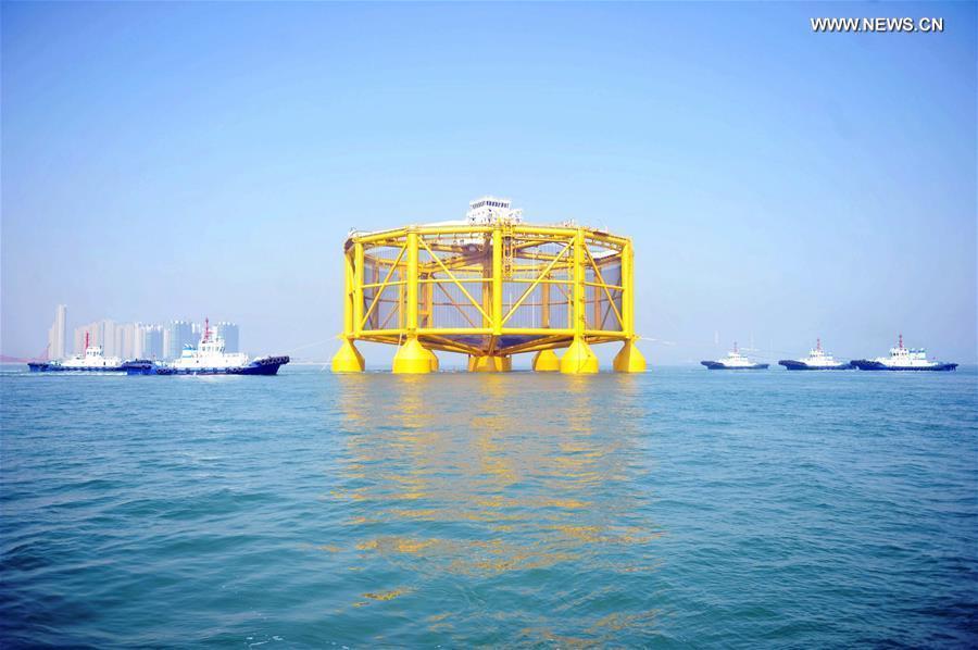 Photo taken on June 14, 2017 shows Ocean Farm 1, an offshore ocean farming facility, being towed by a tugboat in Qingdao, east China's Shandong Province. China Shipping Industry Corp, one of China's major shipbuilders, delivered an intelligent offshore ocean farming facility to Norway in Qingdao on Wednesday. China is delivering a batch of such facilities to Norway, designed to enhance the efficiency and effectiveness of the country's aquaculture industry. (Xinhua/Zhang Jingang)