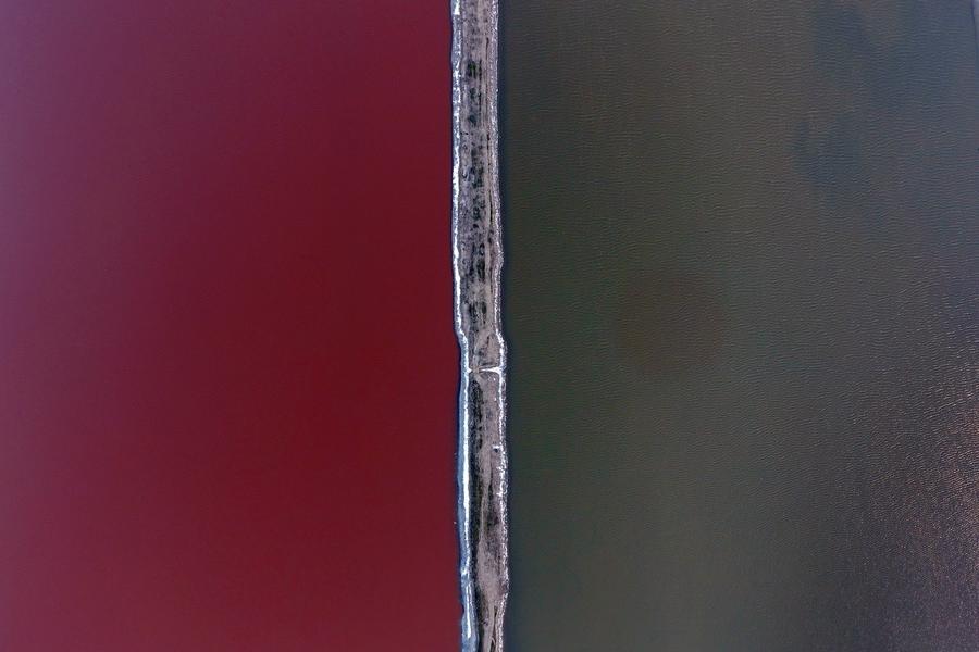 Aerial view of a corner of the salt lake in Yuncheng city, Shanxi province, June 14, 2017. As the temperatures rise in summer, different colors start to appear on the surface of the lake, making it a spectacular scene. (Photo/Xinhua)