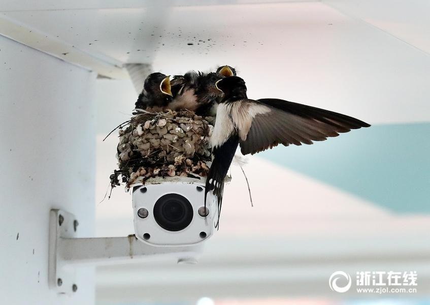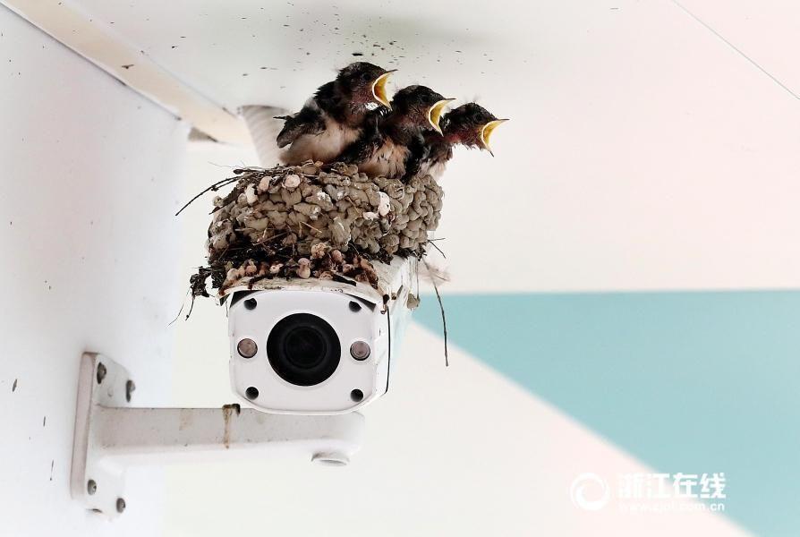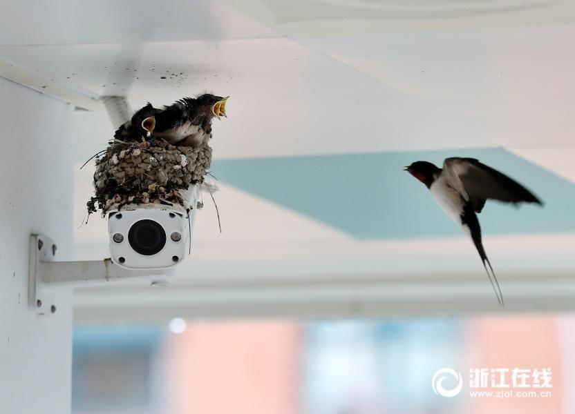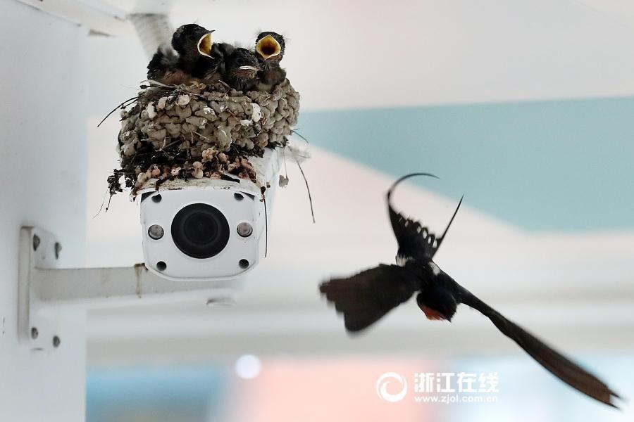 Three little birds were seen shortly after two swallows built a nest on the camera in Xuejun Primary School in Hangzhou, Zhejiang province. Students are attracted by the sound of birds chirping, and they get out of classroom to see newborn birds in the corridor. (Photo/zjol.com.cn)