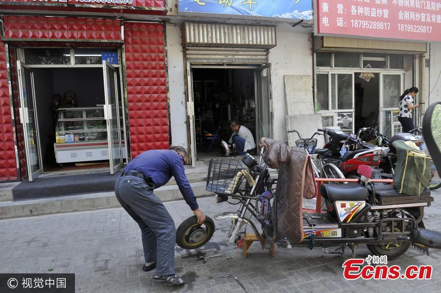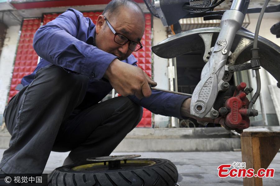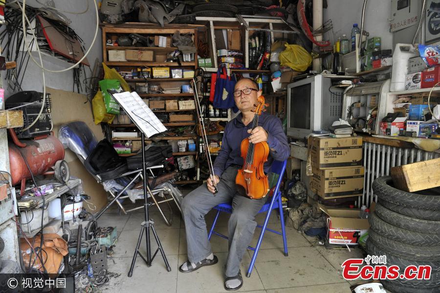 Photos show Yu Aimin repairing a motorcycle, compared with him playing violin at his store in Yinchuan City, Northwest China’s Ningxia Hui Autonomous Region, June 15, 2017. Yu, born in 1958, has enjoyed playing musical instruments since a young age. While serving in the army, he often played erhu, a two-stringed bowed musical instrument. Later, he self-taught himself how to repair bikes and motorcycles, which he makes a living from. However, he still finds time to play music. (Photo/VCG)