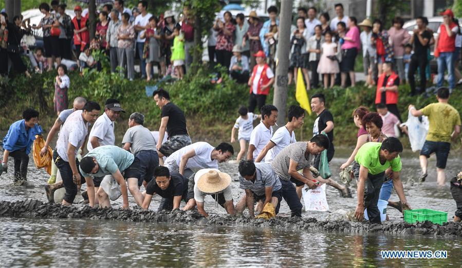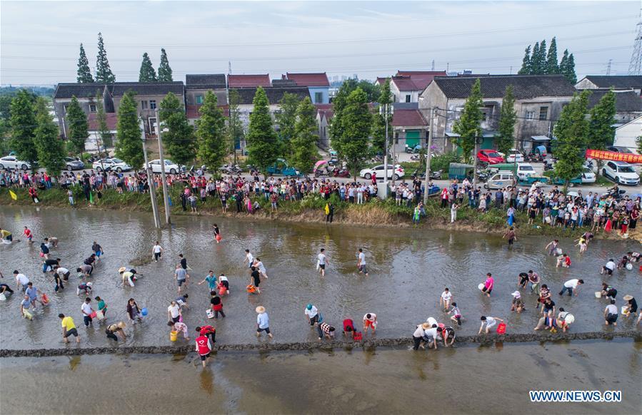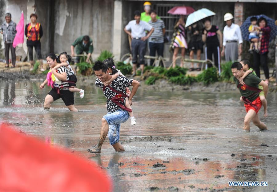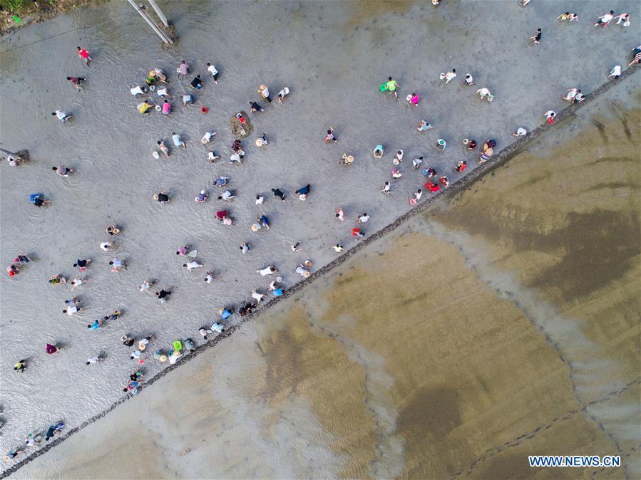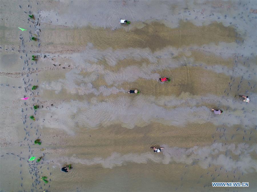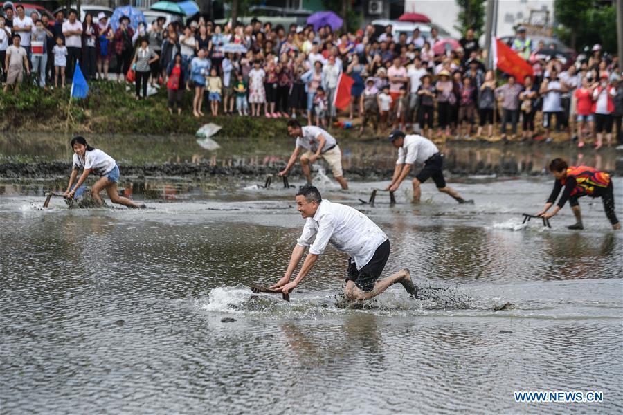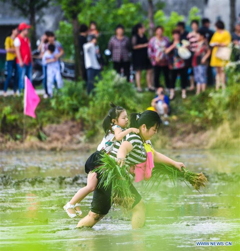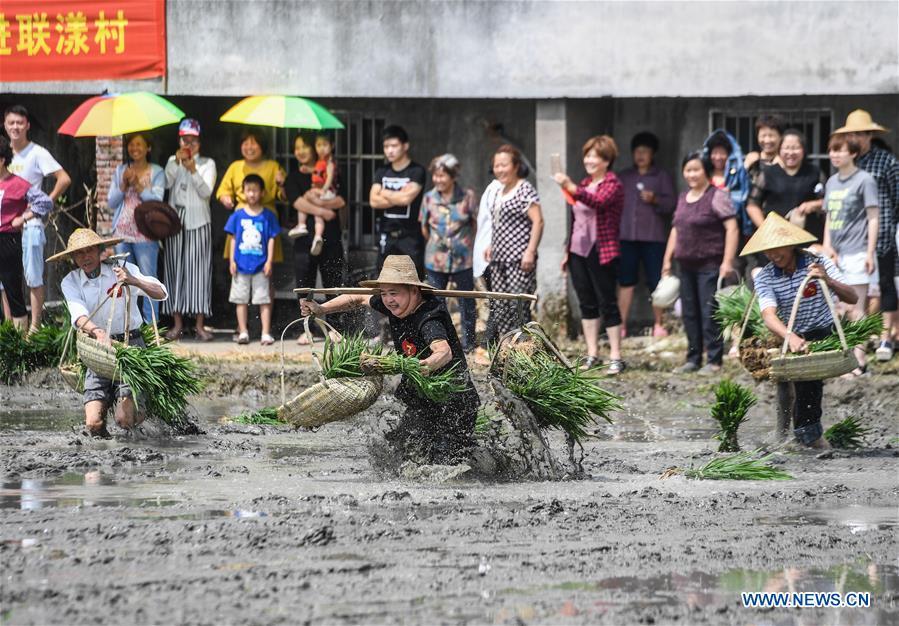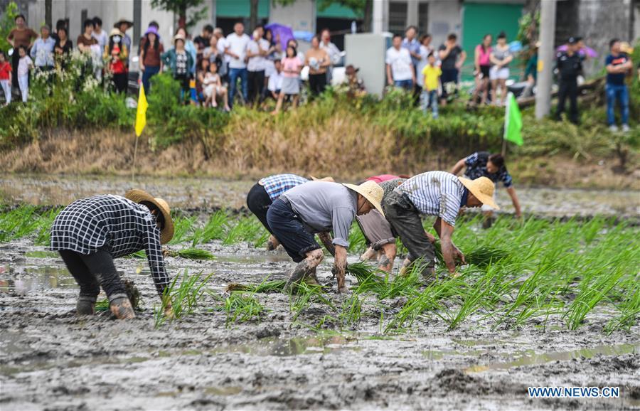 Farmers compete in transplanting rice seedlings at an entertainment sports meeting in Lianyang Village of Huzhou City, east China's Zhejiang Province, June 18, 2017. (Xinhua/Xu Yu)