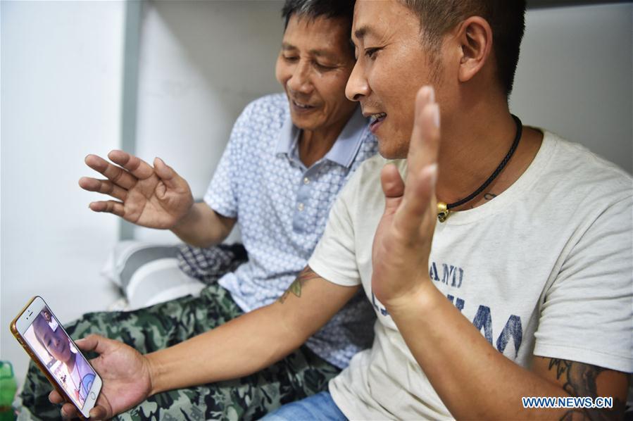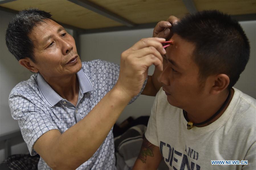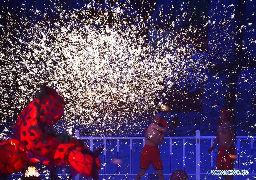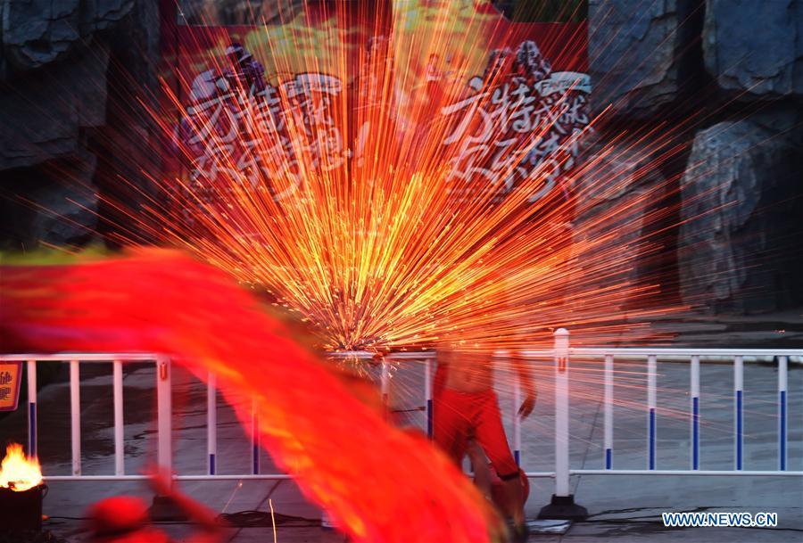 Li Tinggang's dragon dance team performs at Fantawild Adventure in Shenyang, northeast China's Liaoning Province, May 30, 2017. Sixty-four-year-old father Li Chaozhong and 36-year-old son Li Tinggang are leaders of a dragon dance team. Li Tinggang followed his father in performing dragon dance when he was 21. Though splashing iron water during dragon dance is dangerous, both the father and son aim to pass the traditional performance along to the future generations. (Xinhua/Long Lei)