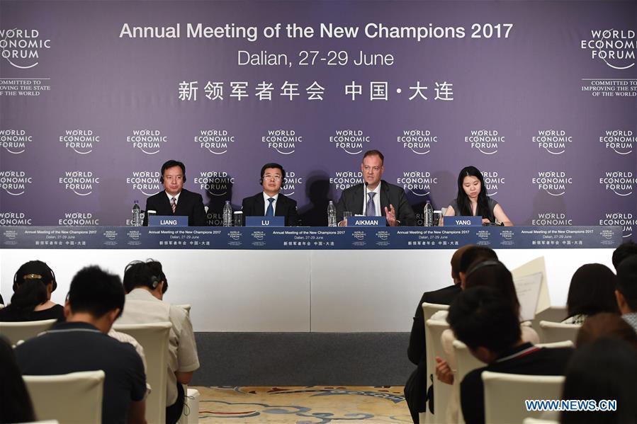 A press conference about the upcoming Annual Meeting of the New Champions 2017 is held in Beijing, capital of China, June 20, 2017. The meeting, also known as Summer Davos, will be held in China's northeast coastal city Dalian from June 27 to 29. (Xinhua/Shen Hong)