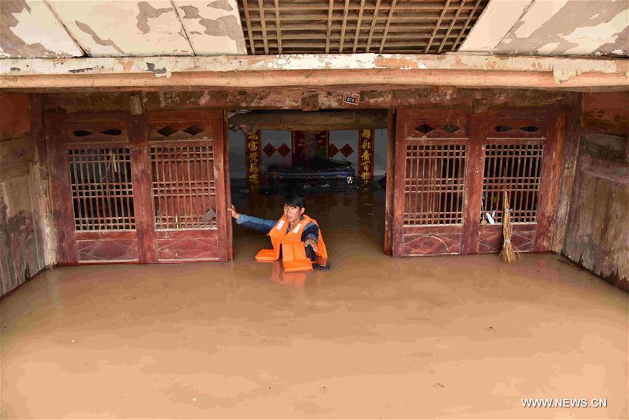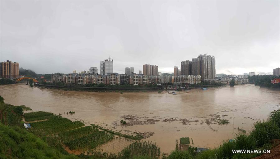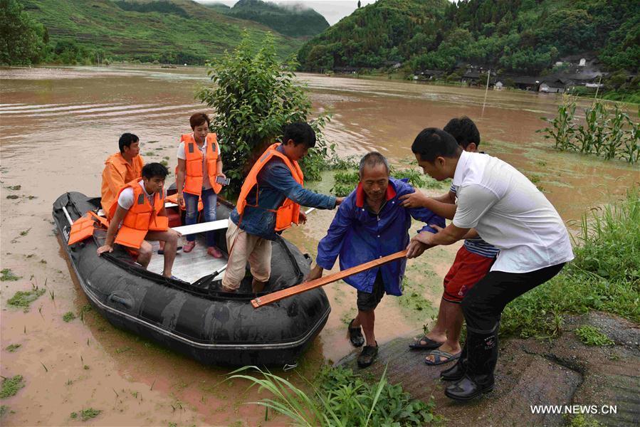 Local residents are evacuated in Songtao Miao Autonomous County of Tongren City, southwest China's Guizhou Province, June 23, 2017. Flash floods broke out here due to continuous heavy rainfall. (Xinhua/Long Yuanbin)