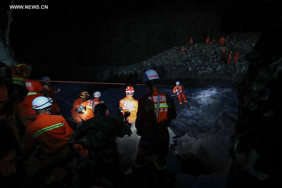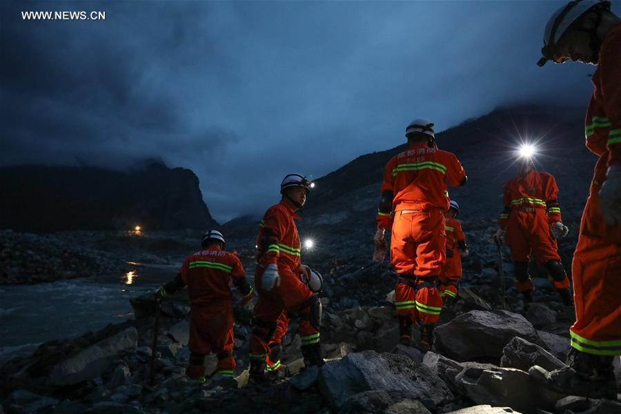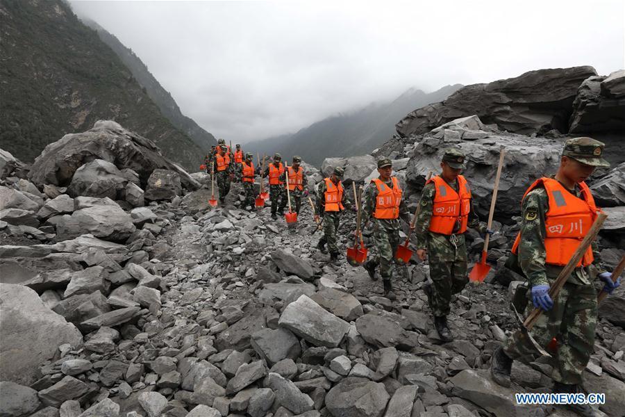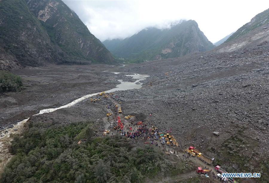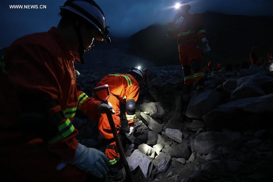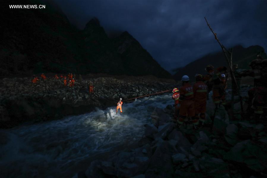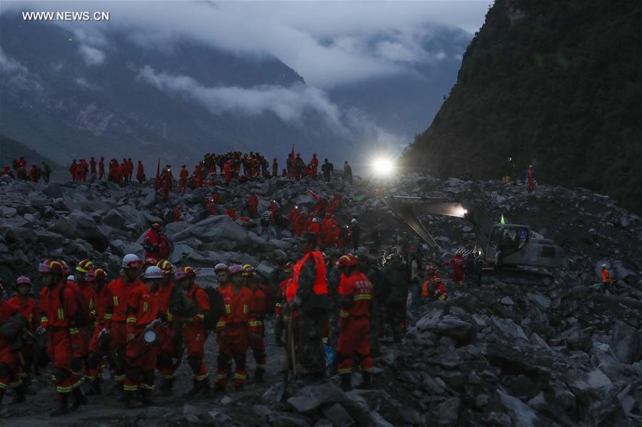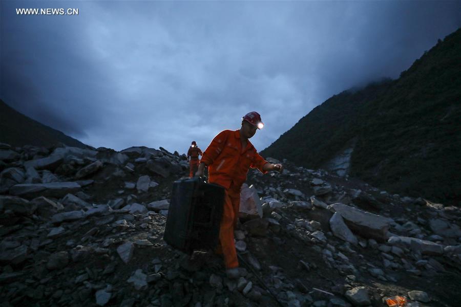 Rescuers work at the accident site after a landslide occurred in Xinmo village of Maoxian county, Tibetan and Qiang autonomous prefecture of Aba, Southwest China's Sichuan province, June 24, 2017. (Photo/Xinhua)