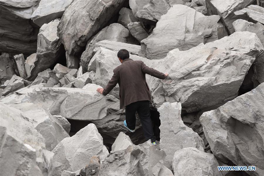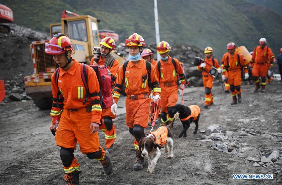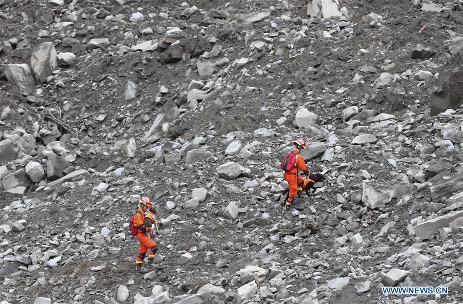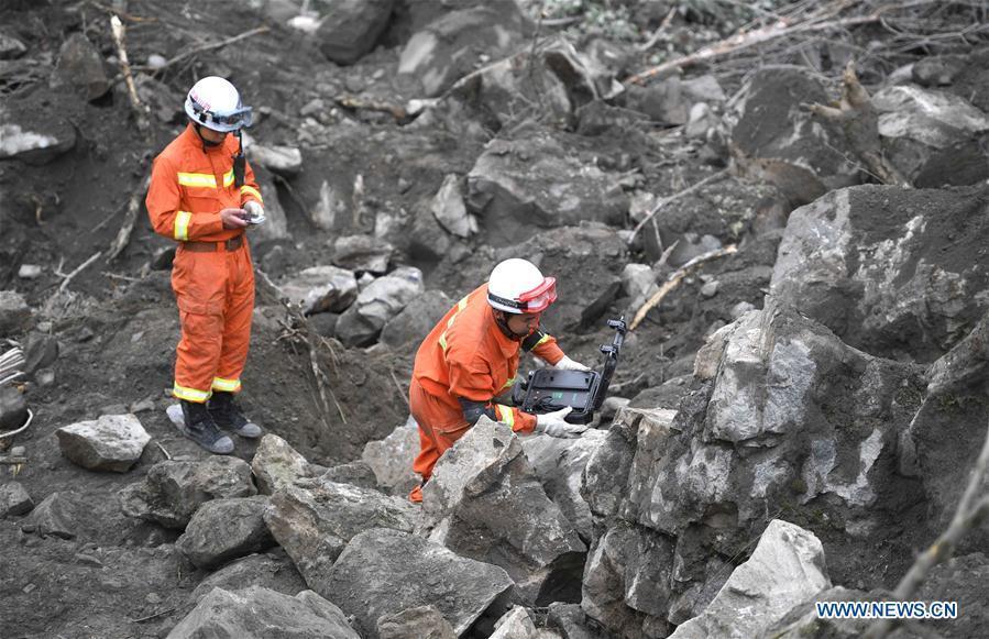Rescuers search for survivors among random rubble with life detector after a landslide in Xinmo Village of Maoxian County, Tibetan and Qiang Autonomous Prefecture of Aba, southwest China's Sichuan Province, June 25, 2017. Fifteen people had been taken off the list of missing people after the landslide in Sichuan early Saturday, leaving 93 still missing. (Xinhua/Xue Yubin)