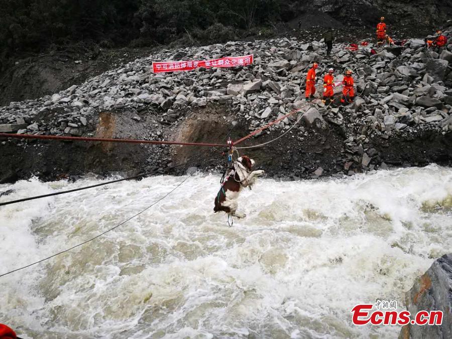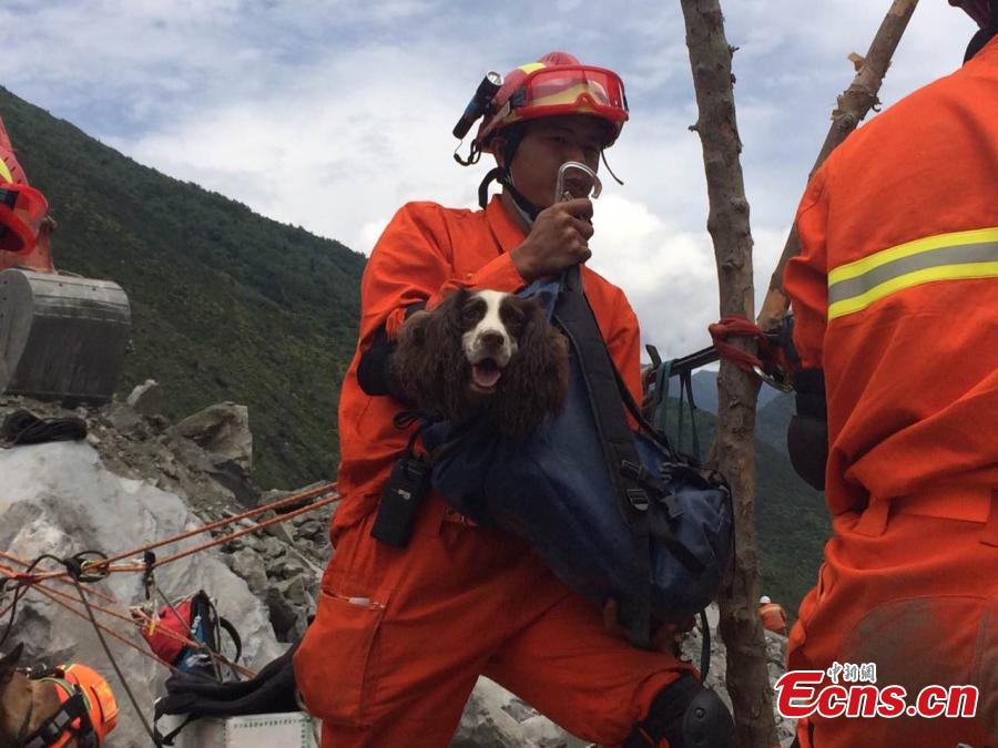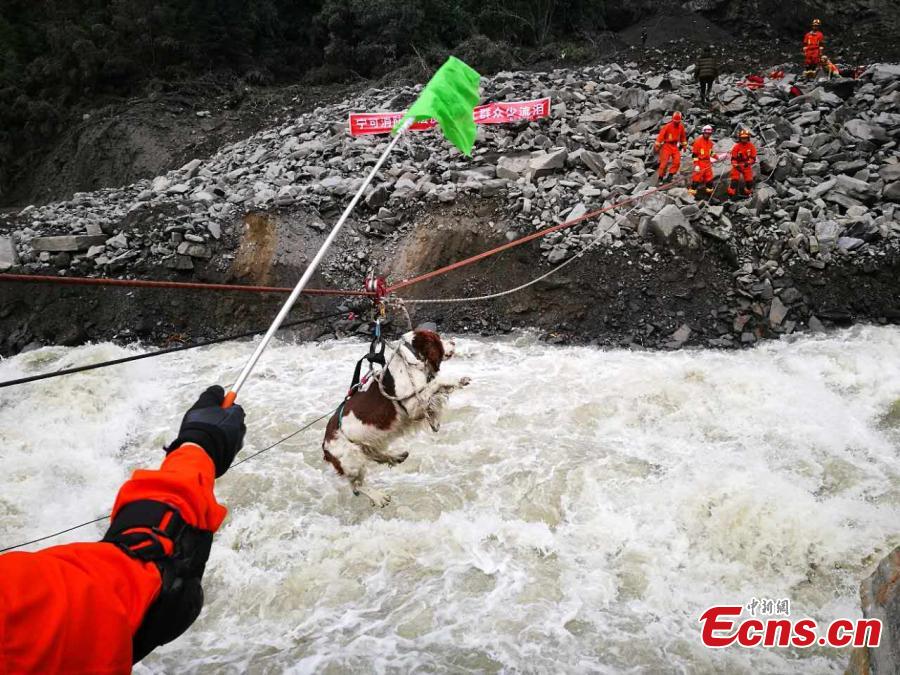 A search dog is transported across a river to help find the missing after a massive landslide in Xinmo Village in Maoxian County, Tibetan and Qiang Autonomous Prefecture of Aba, Southwest China’s Sichuan Province, June 24, 2017. Xu Zhiwen, the deputy chief of the prefecture, said that by 2 p.m. Sunday, 10 people had been confirmed dead and 15 others confirmed as not being in the village when the accident occurred, leaving 93 still missing. (Photo: China News Service/An Yuan)