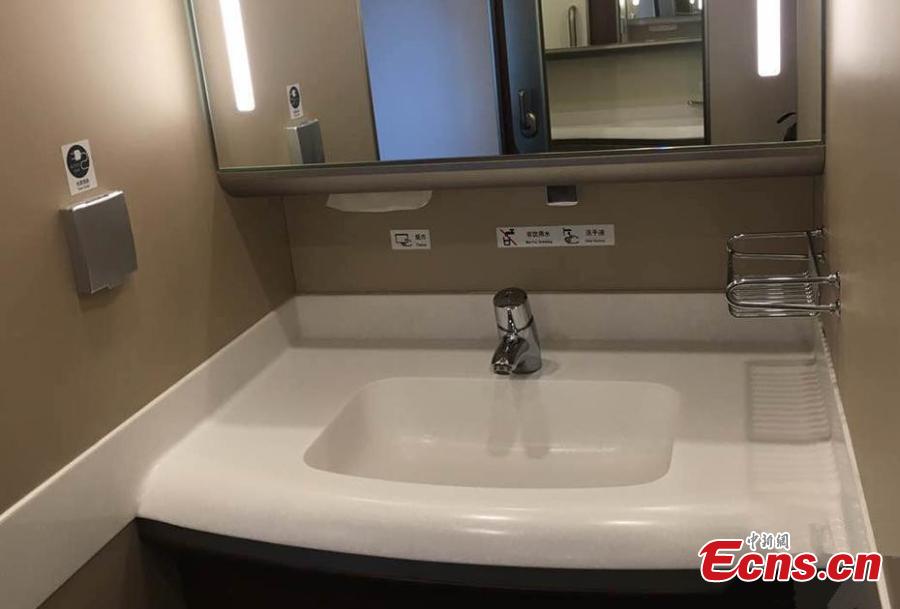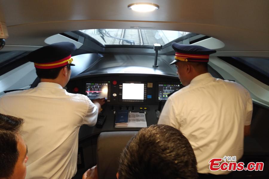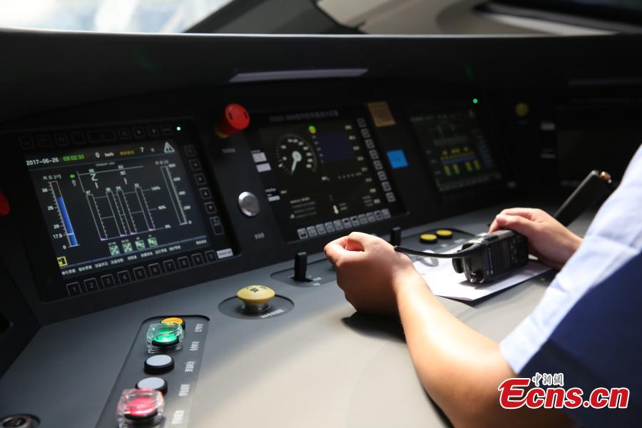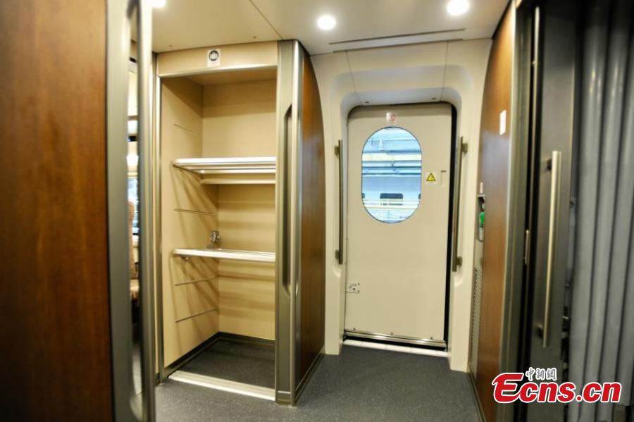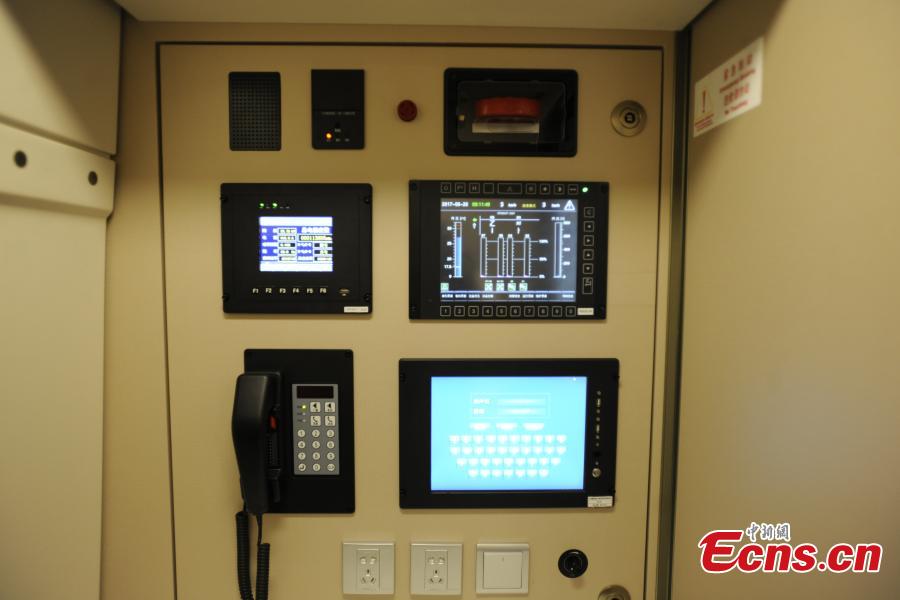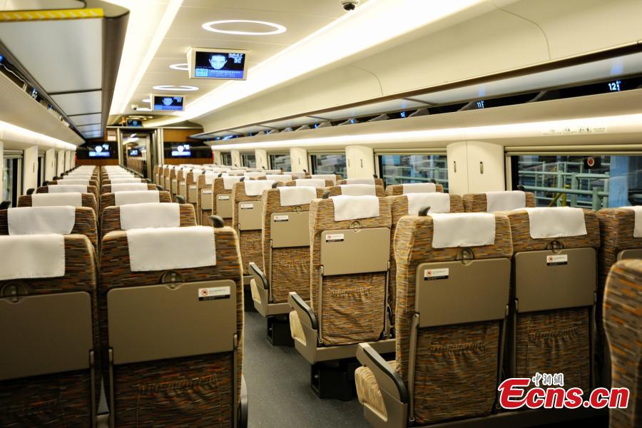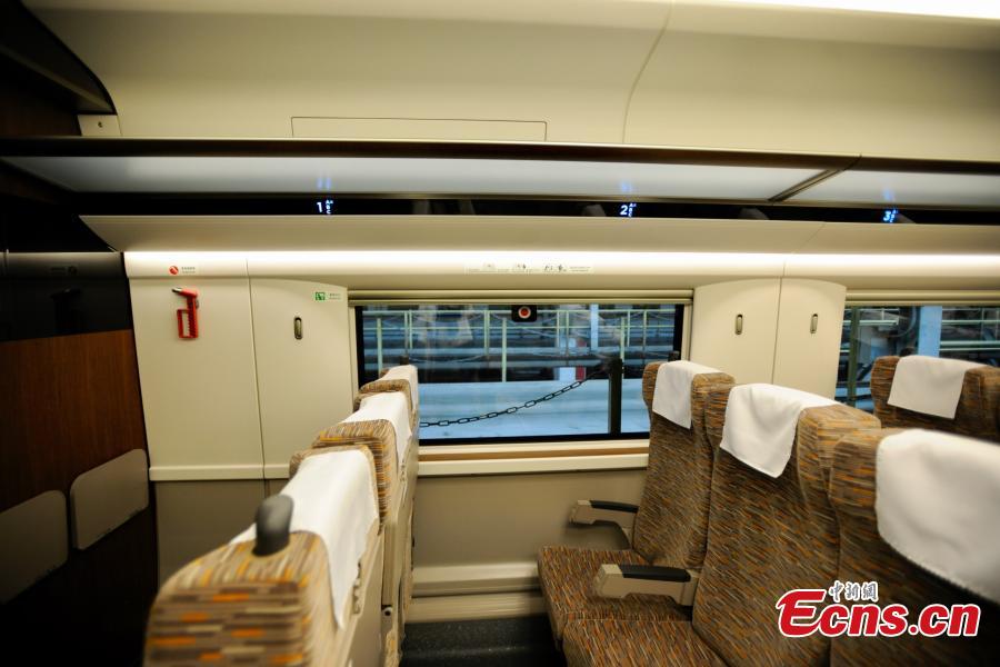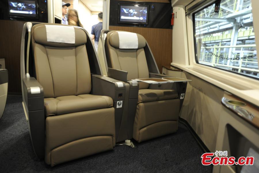 A close-up look at the inside of a new model of bullet train -- the Fuxing, otherwise known as Rejuvenation in English -- that will run on the Beijing-Shanghai high-speed railway line, June 26, 2017. Lu Dongfu, the general manager of the China Railway Corp, says the new train model was mainly developed based on China's railway standards and technologies, and was designed to be better adapted to China's environment and rail transport patterns. China holds complete intellectual property rights of "Fuxing" high speed trains. Two new "Fuxing" trains will debut on Beijing-Shanghai high speed railway line on June 26, 2017 in Beijing and Shanghai at the same time. (Photo: China News Service/Zhai Lu)
