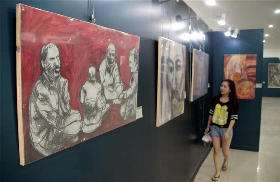 A visitor looks at a painting at the Suzhou Open University in Jiangsu province, June 25, 2017. (Photo/Asianewsphoto)