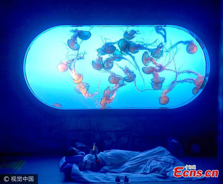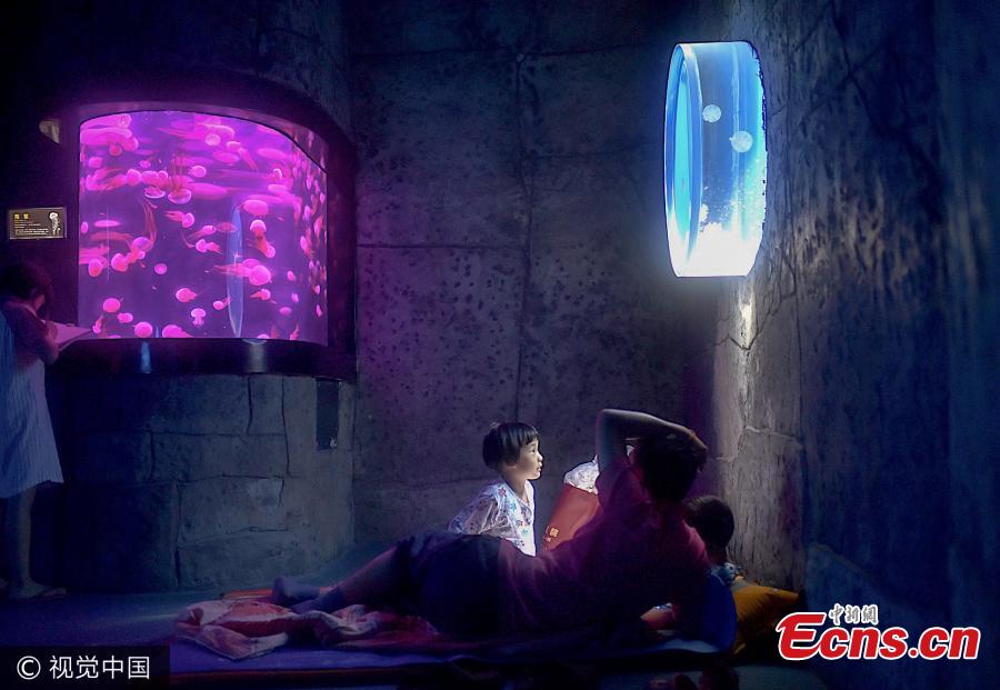 Visitors look at fish swimming in tank during a sleepover event at an aquarium in Nanjing, Jiangsu province on June 24, 2017. The aquarium invited visitors to spend a fun-filled night exploring the mysterious creatures of the sea. (Photo/VCG)