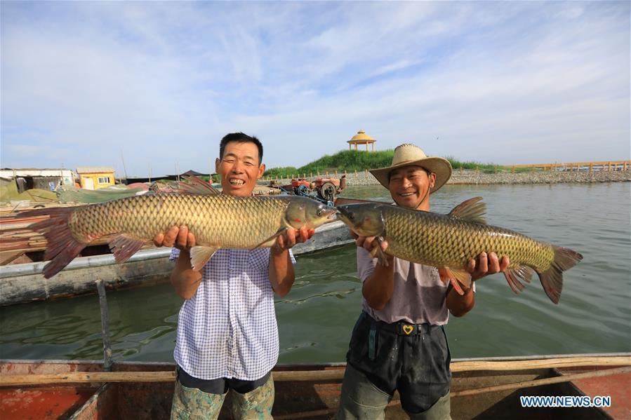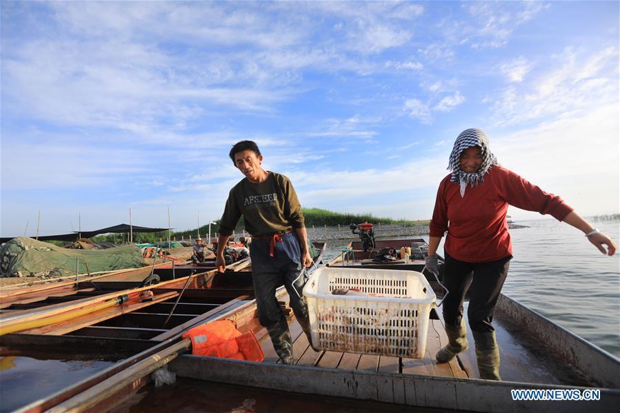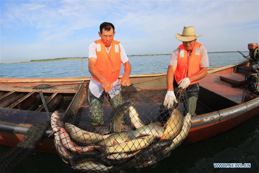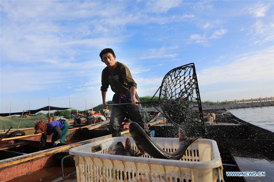 Fishermen unload their catch at a wharf at Bostan Lake in Bohu County, northwest China's Xinjiang Uygur Autonomous Region, June 28, 2017. (Xinhua/Nian Lei)