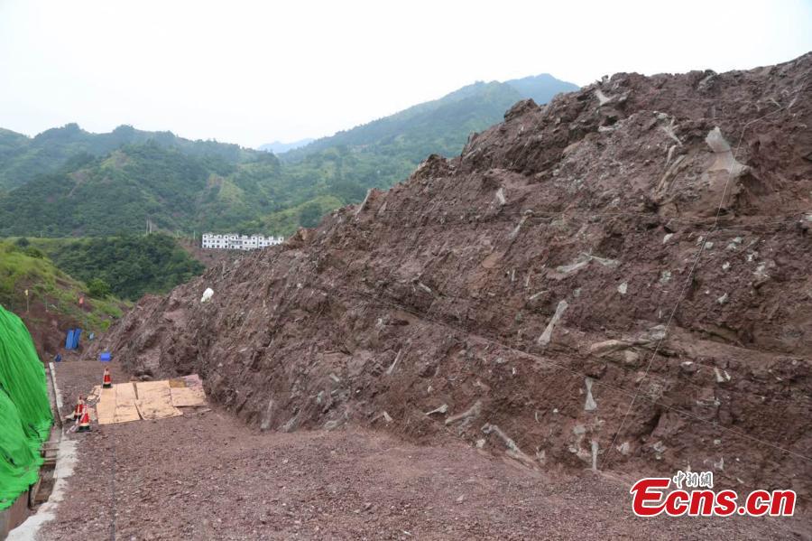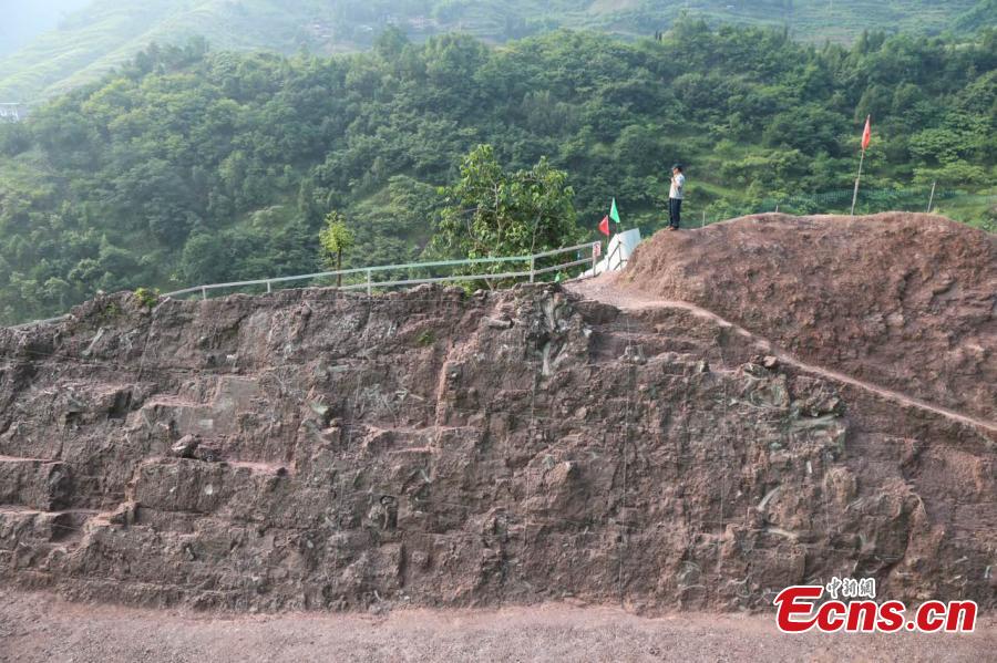 A view of the site where dinosaur fossils were found in Laojun Village, Pu’an Township, Yunyang County, Southwest China’s Chongqing Municipality, which announced the discovery on Wednesday. The dinosaur fossils are from at least five species and concentrated in a wall 150 meters long, 2 meters deep and 8 meters tall, close to a branch of the Yangtze River. An expert said the findings in Pu’an helps research into the evolution of dinosaurs. (Photo: China News Service/Deng Lei)