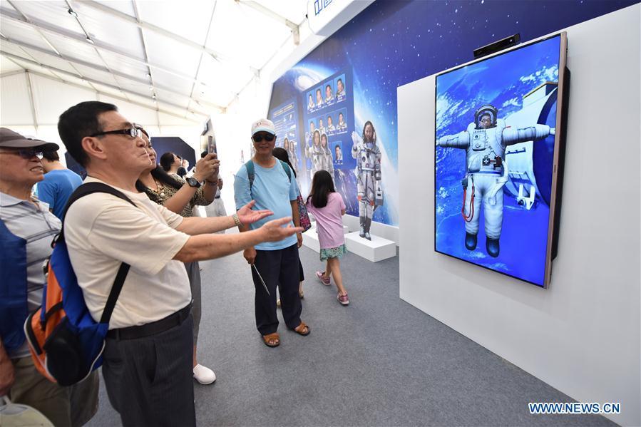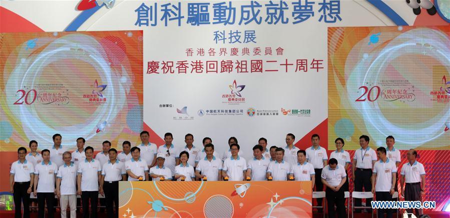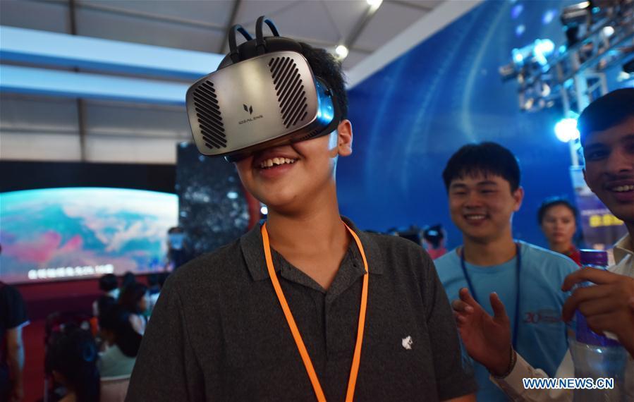 A boy experiences a VR product at a high-tech exhibition at Victoria Park in Hong Kong, south China, on June 28, 2017. The exhibition named "Innovation in Science and Technology, Realization of Our Dreams" kicked off here on Wednesday with more than 100 exhibits showcasing China's achievements on aerospace science and technology. The exhibition was held to celebrate the 20th anniversary of Hong Kong's return to the motherland. (Xinhua/Lui Siu Wai)