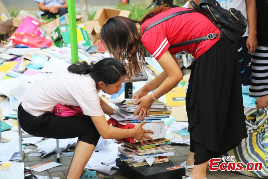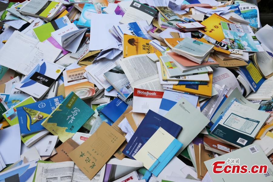 Garbage collectors take books and study notes from graduates near a dormitory room at a university in Zhengzhou City, the capital of East China’s Henan Province, June 28, 2017. Some students say they are able to sell on textbooks they bought for 800 yuan ($118) two years ago for just 10 yuan. (Photo/VCG)