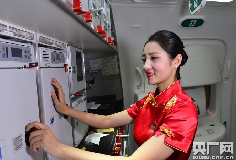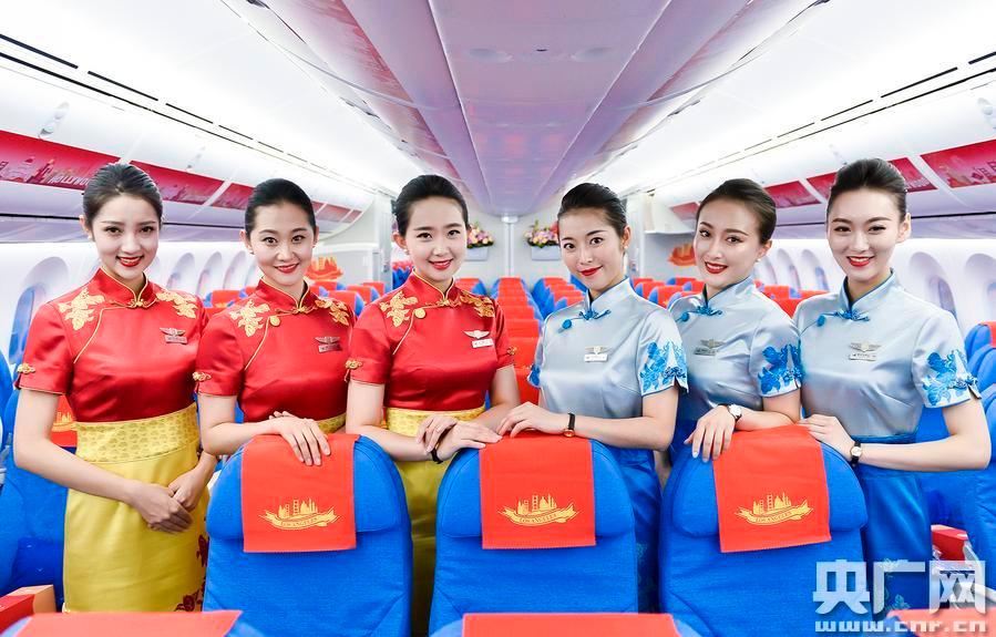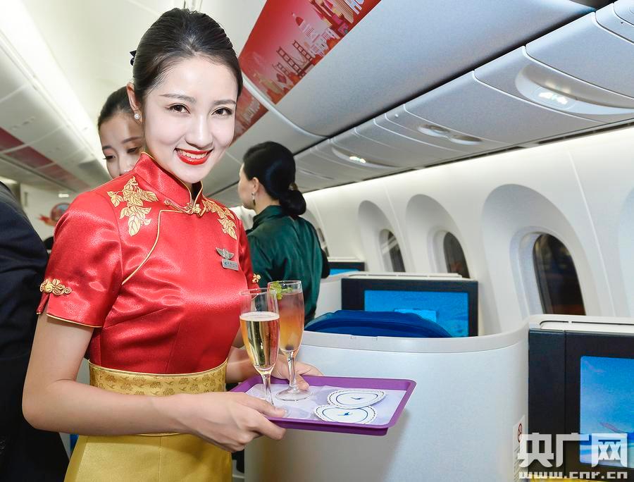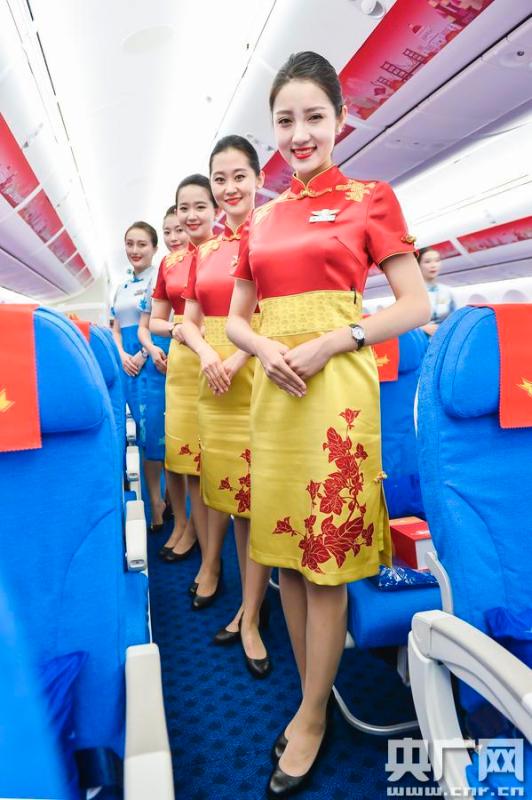 The new set of uniforms designed for specially chartered flight attendants is adopted from the style of the qipao, and the material used is the splendid Chinese Song brocade, decorated with texture of triangle plum, so as to send greetings from the East to the whole world.