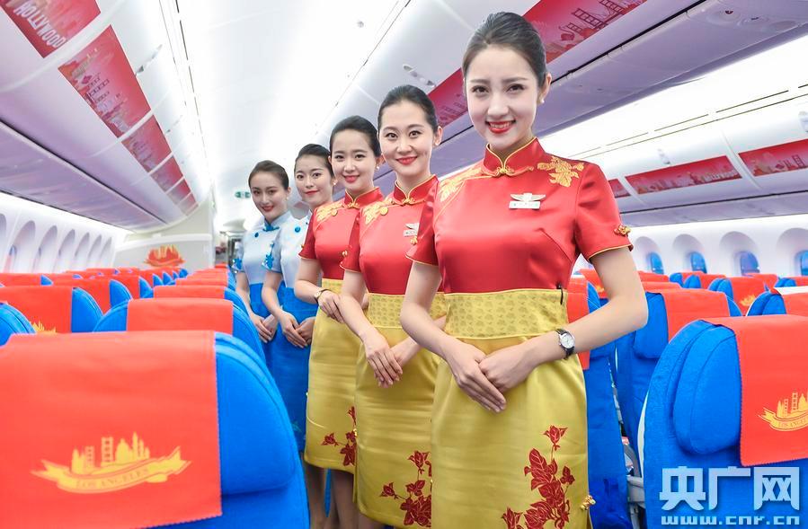 A new set of uniforms for flight attendants of Xiamen Airlines was unveiled on the inaugural ceremony of the non-stop flight route connecting Xiamen with Los Angeles on June 27. (Photo/CNR.cn)