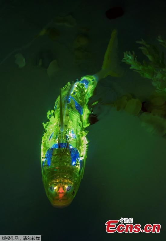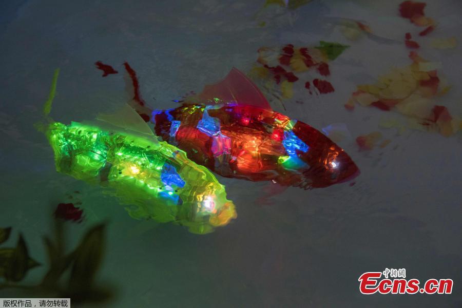 AI-based robot fish known as MIRO (Marine Intelligent Robot), developed by South Korean company AIRO, are seen swimming in a pool during a demonstration as the Advanced Content Technology Expo in Tokyo on June 29, 2017. (Photo/Agencies)