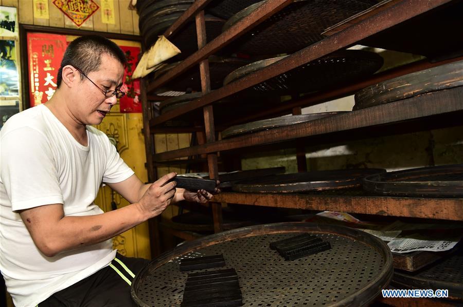 Inheritor Chen Jhun Tien shows the ink he made at his studio in New Taipei of southeast China's Taiwan, June 29, 2017. Chen, 43 years old, inherited the handicraft of making ink from his father, who studied the skill from an artist in Fuzhou of southeast China's Fujian Province and opened his own ink factory in New Taipei afterwards. (Xinhua/Liu Junxi)