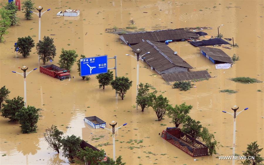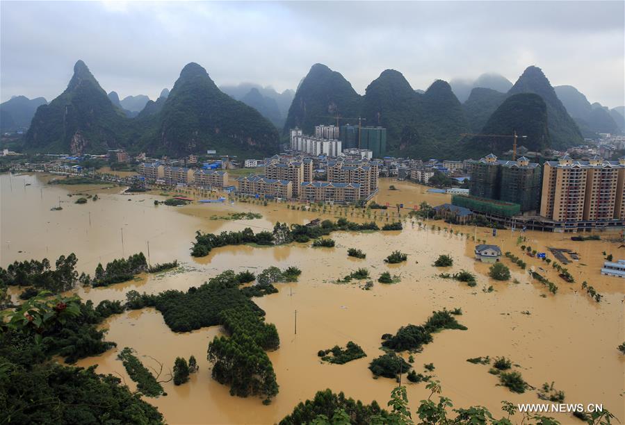Rescuers transfer trapped persons in flood-hit Rongshui Miao Autonomous County, south China's Guangxi Zhuang Autonomous Region, July 2, 2017. Consecutive heavy rains raised the water level in Rongjiang River, which resulted in flood in the county. (Xinhua/Zhang Ailin)