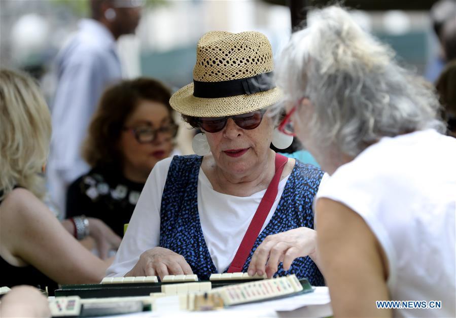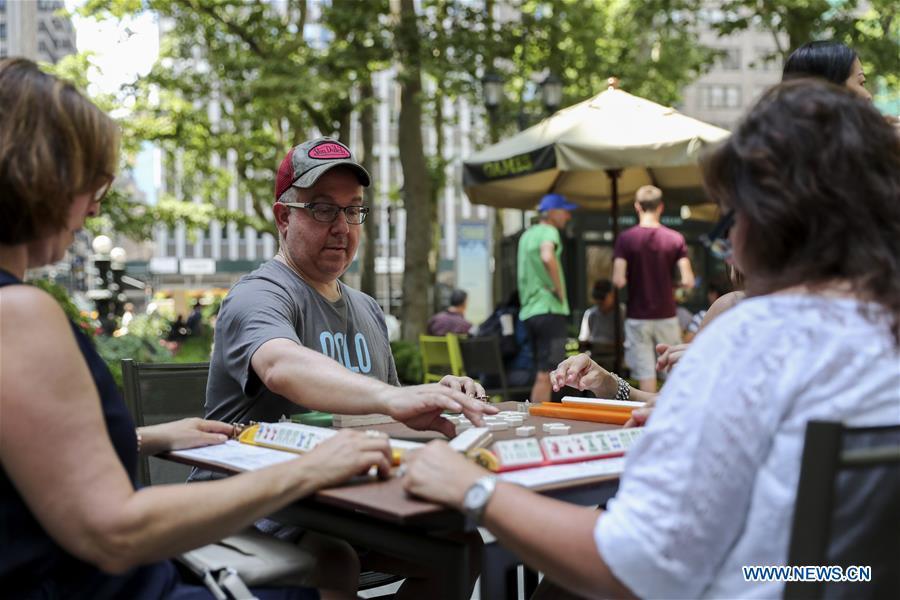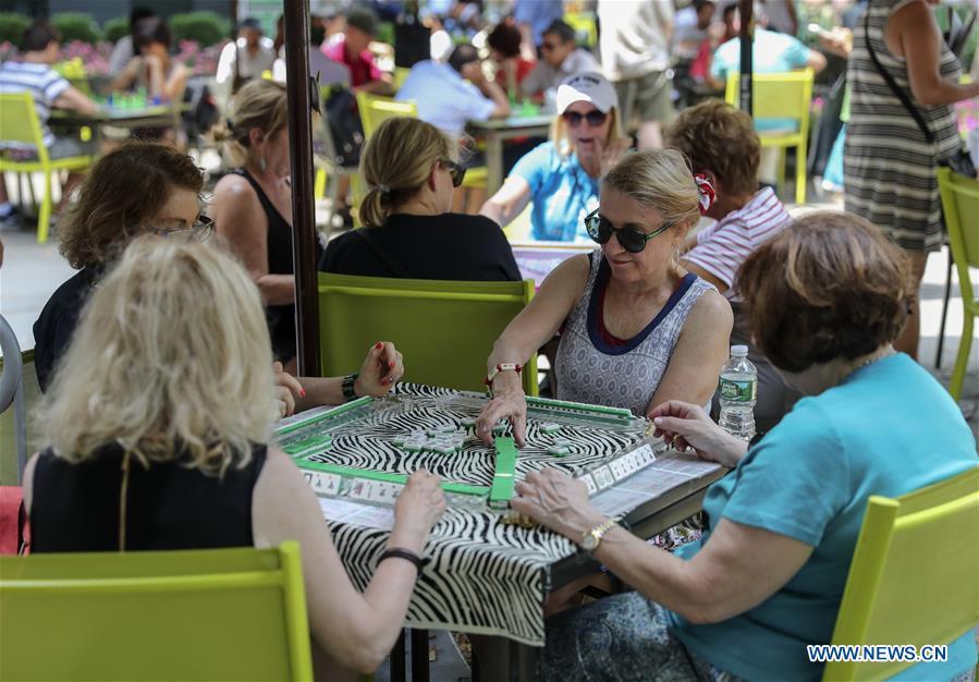 Hobbyists play Mah Jongg during the "Mah Jongg Marathon" event at Bryant Park in New York City, the United States, on July 3, 2017. According to event organizer Linda Fisher, the event is organized to provide a place for Mah Jongg hobbyists to communicate with each other and promote the game to more people. Mah Jongg, originated from China, was introduced to the United States in the 1920s. (Xinhua/Wang Ying)