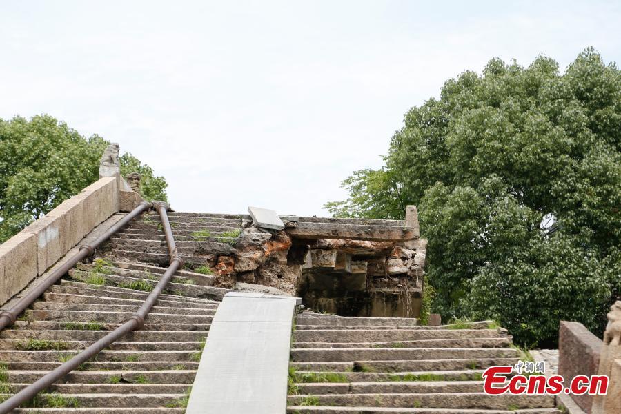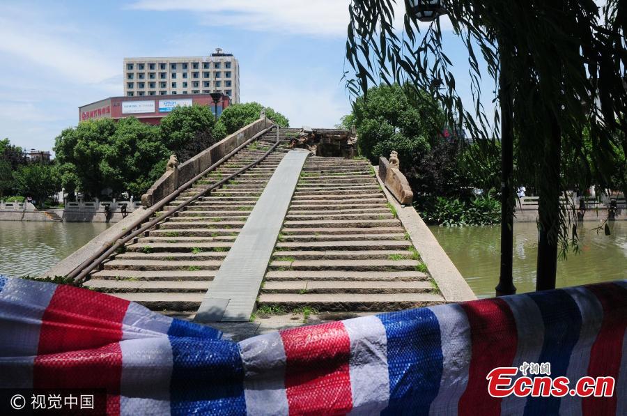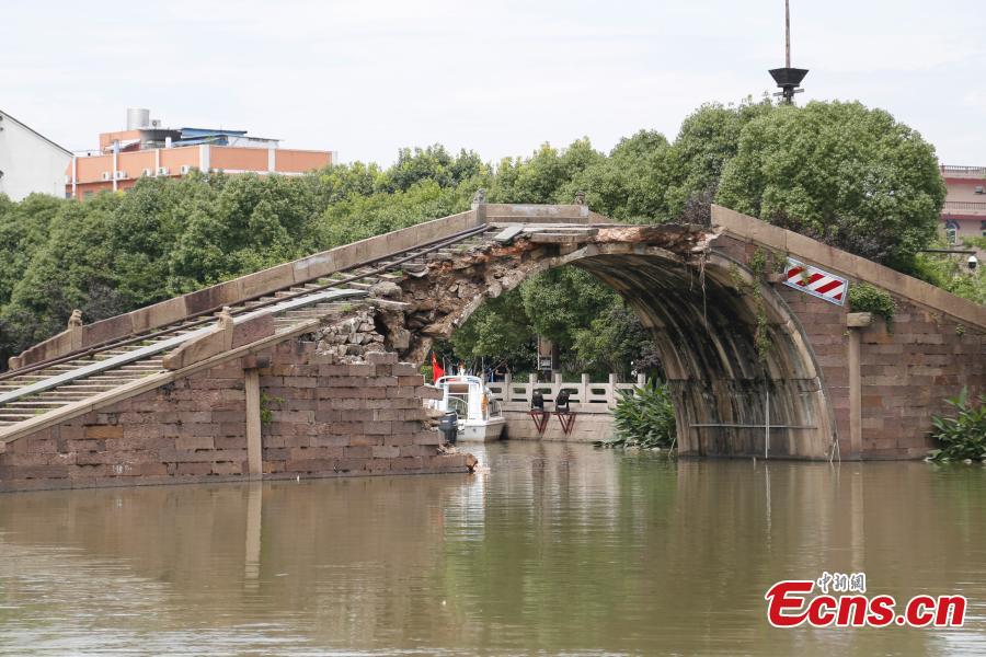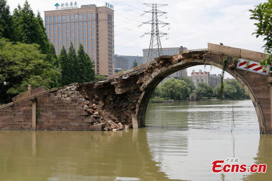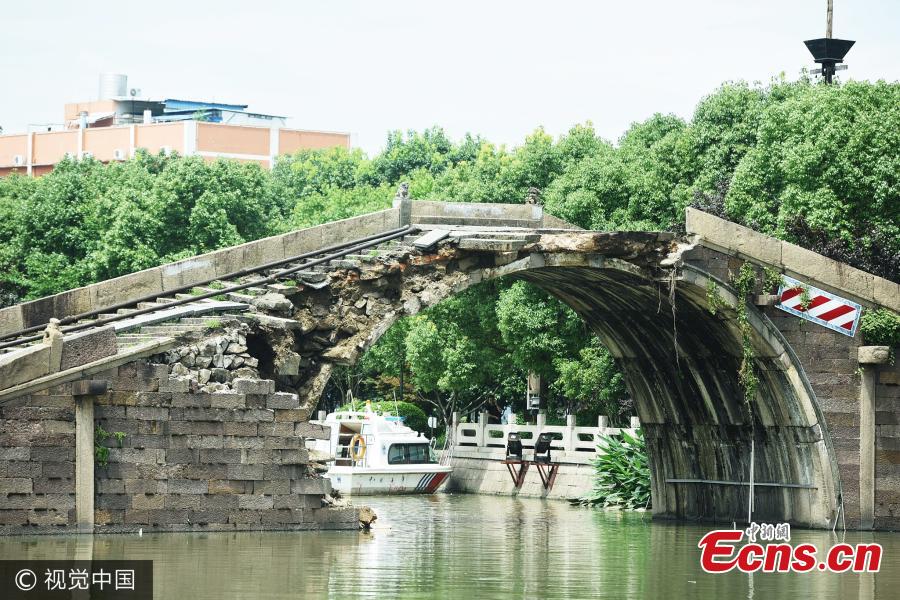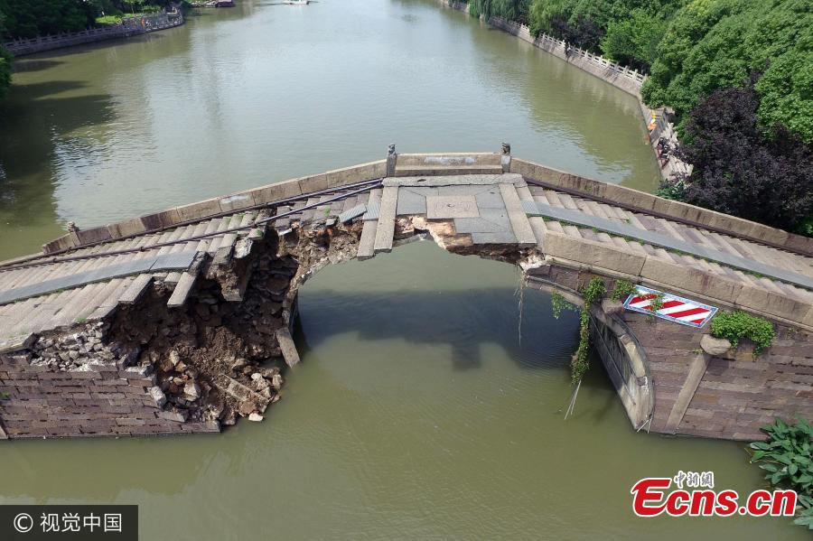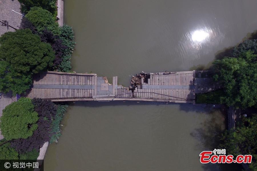 A section of the Yongning Bridge on the Grand Canal collapses after days of strong rainfall in Hangzhou City, capital of East China’s Zhejiang Province, July 6, 2017. Built in 1770 during the Qing Dynasty, the bridge is 47 meters long and 8 meters wide. The vast Grand Canal waterway runs from Beijing to Zhejiang and is a UNESCO World Heritage Site. (Photo/VCG)