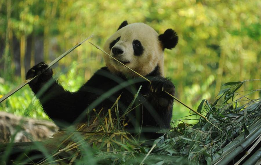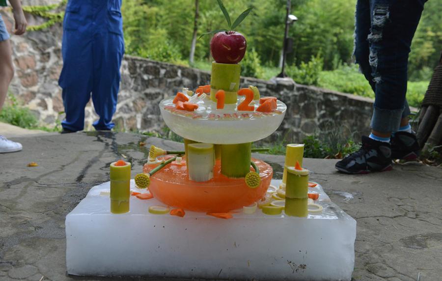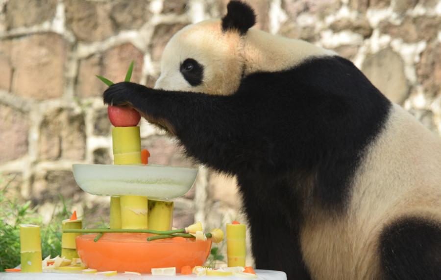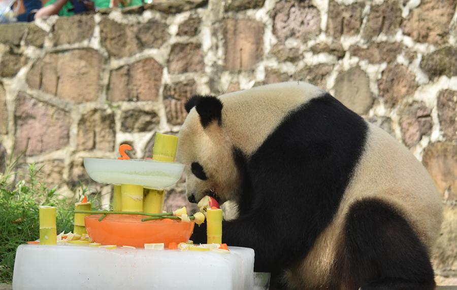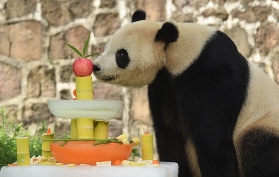 Born on July 9, 2005 in Washington, U.S., giant panda Tai Shan smells the birthday cake keepers prepared for him in Dujiangyan Base of China Conservation and Research Center for the Giant Panda in Southwest China's Sichuan Province on July 9. (Photo/Courtesy of China Conservation and Research Center for the Giant Panda)