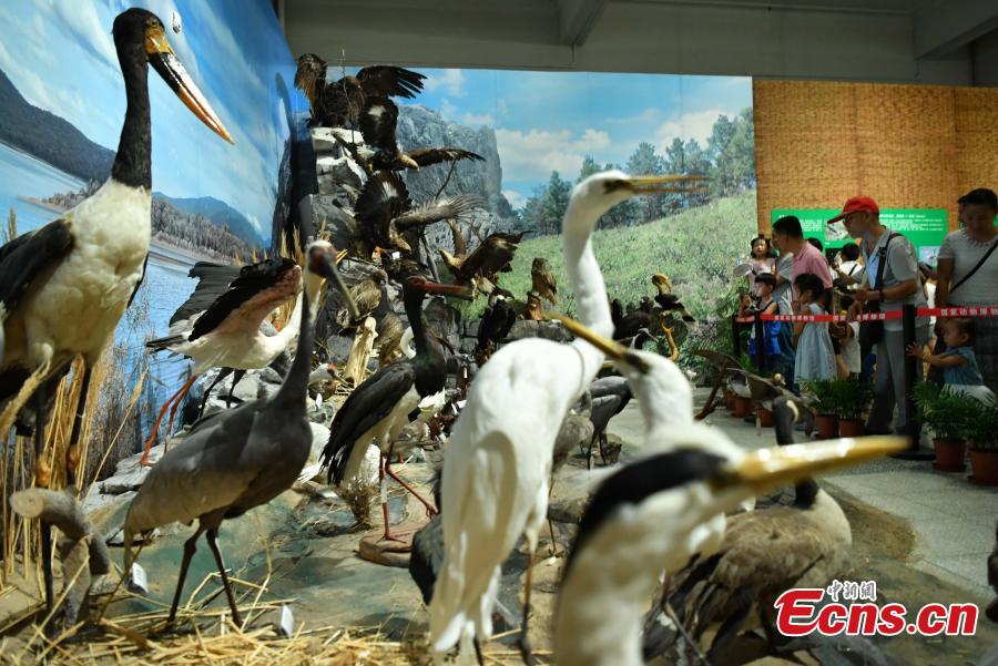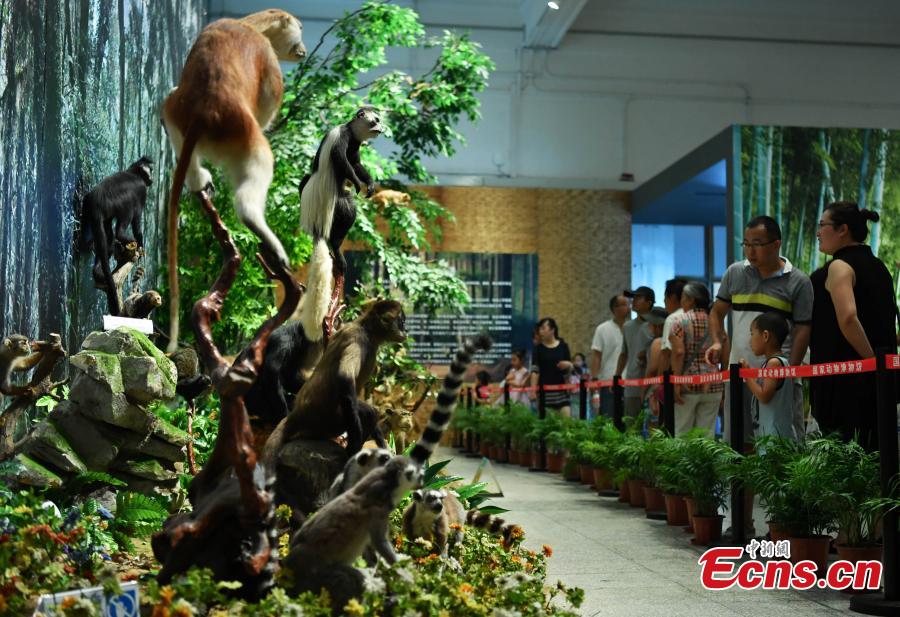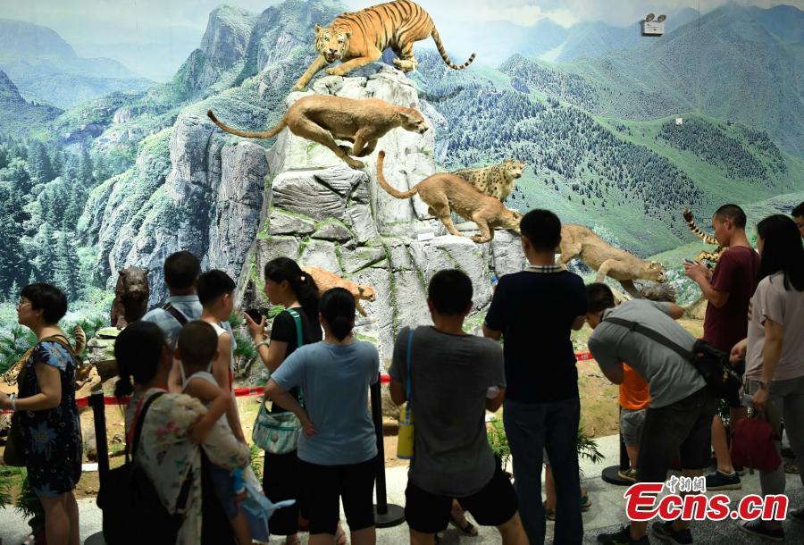 Visitors look at animal specimens during a show at the Museum of Hebei Province in Shijiazhuang City, the capital of North China’s Hebei Province, July 9, 2017. Some 324 specimens from 222 species of rare animals are on show at the museum. (Photo: China News Service/Zhai Yujia)