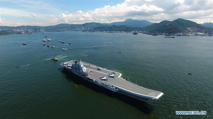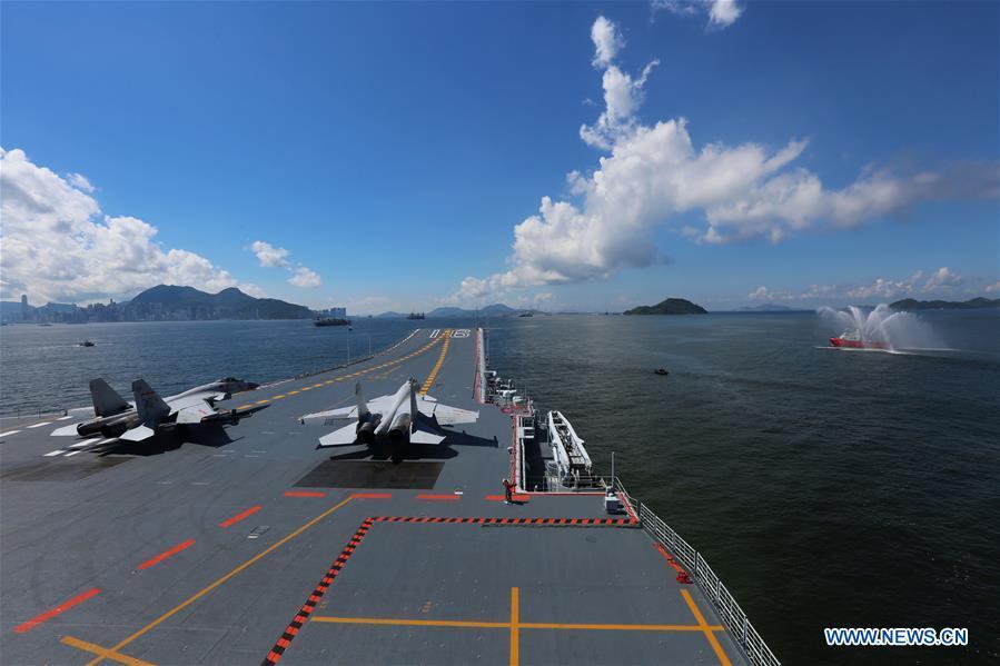 China's first aircraft carrier, the Liaoning, leaves after wrapping up a five-day visit to the Hong Kong Special Administrative Region (SAR), south China, July 11, 2017. A departure ceremony was held at the Ngong Shuen Chau Barracks of the People's Liberation Army (PLA) Hong Kong Garrison by the HKSAR government. (Xinhua/Zeng Tao)