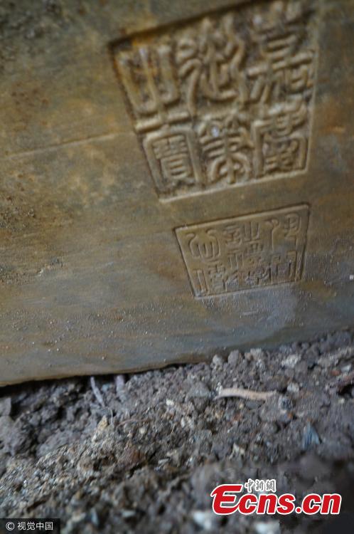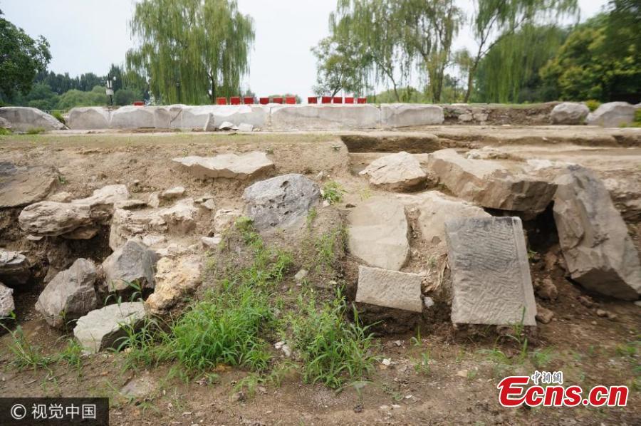 Two stones engraved with inscriptions from Emperor Jiaqing of the Qing Dynasty (1644-1911) are among relics found at Ruyuan Garden in Yuanmingyuan Park, the Old Summer Palace, in Beijing, July 11, 2017. A massive archaeological excavation underway at the park has uncovered more than 50,000 cultural relics so far. (Photo/VCG)