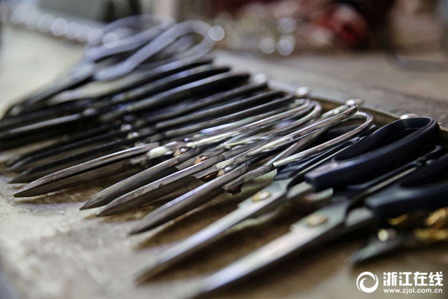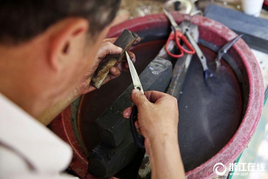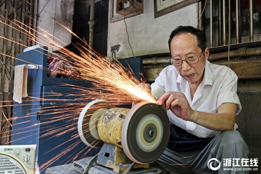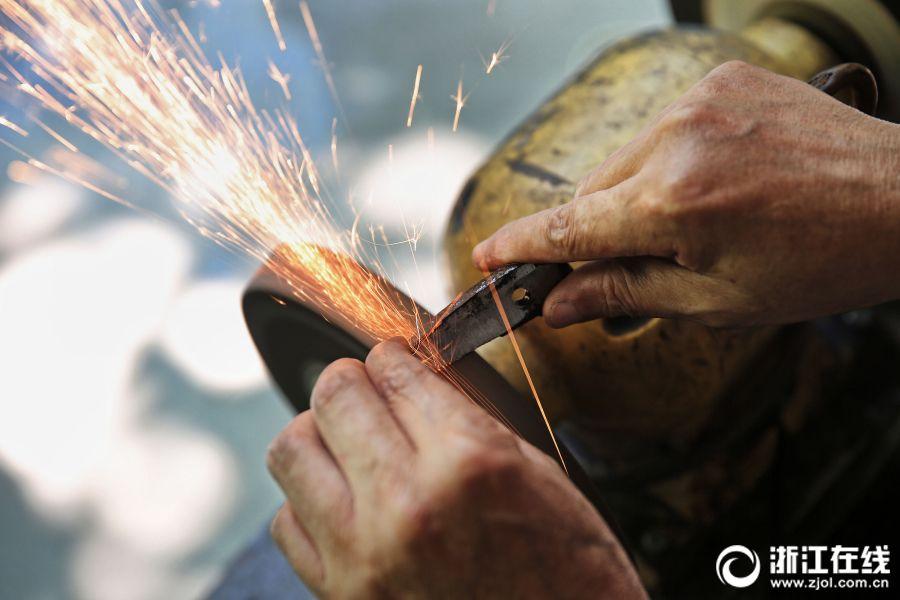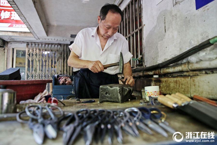 72-year-old knife-grinder Du Jikun is sharpening a pair of scissors in Hangzhou, east China's Zhejiang Province, on July 12, 2017. (Photo/zjol.com.cn)